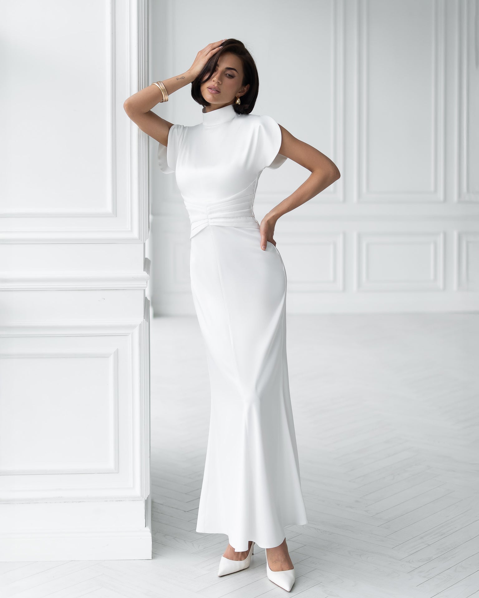 Exuding couture polish, the ELYSIA HIGH-NECK GOWN is cut from dense Mango satin that drapes fluidly while holding impeccable structure. A sculpted mock-neck bodice flows into softly moulded tulip sleeves and a ruched waist panel that sculpts the mid-section. The column skirt skims the hips before sweeping into a subtle mermaid flare, delivering statuesque elegance for red-carpet evenings, winter galas or black-tie weddings.