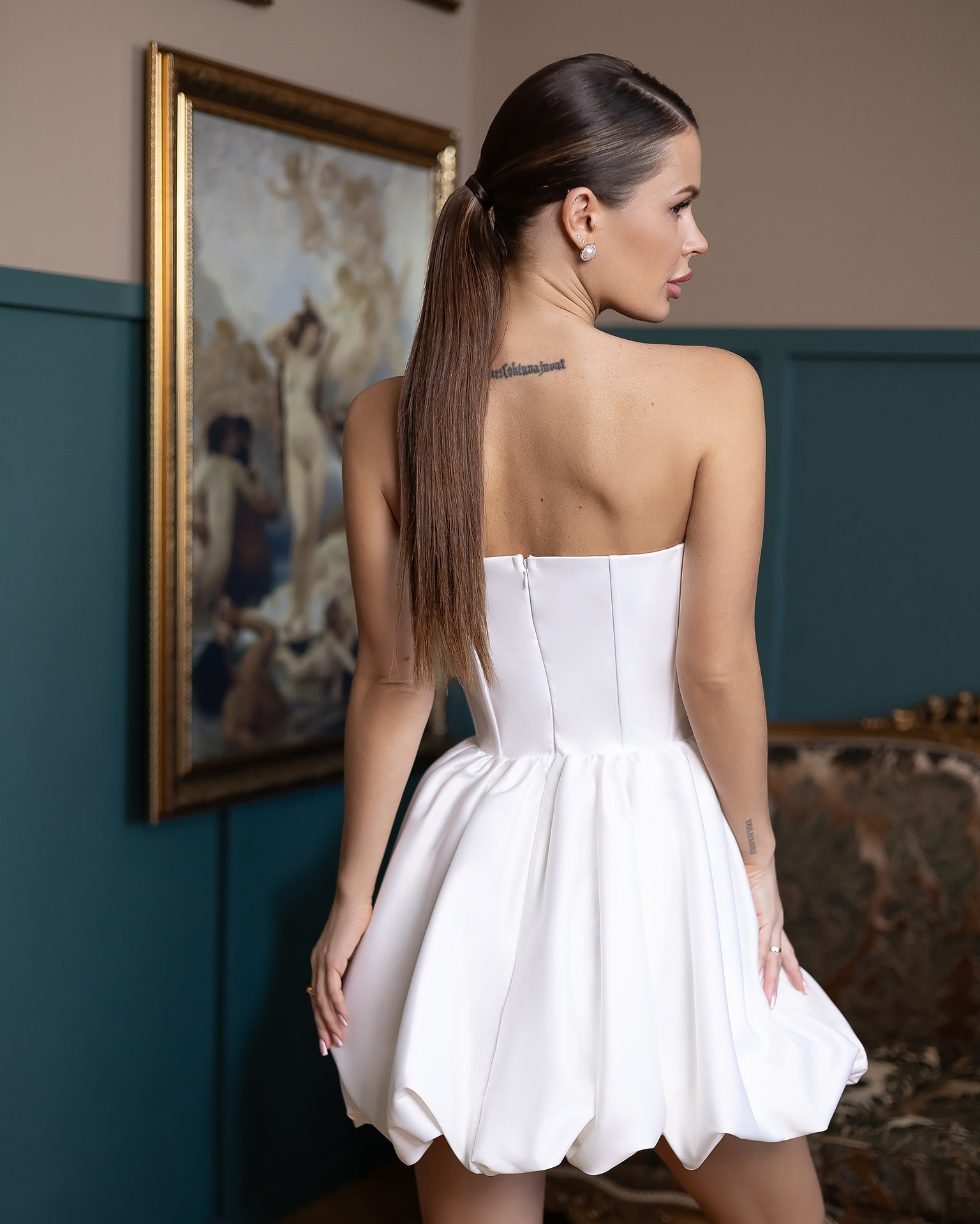 Das LYRA CORSET KLEID ist pure Feier: ein geformtes trägerloses Oberteil kombiniert mit einem voluminösen Minirock mit Blasen-Saum, gefertigt aus luxuriösem Royal Mango Satin. Interne Stäbchen formen die Taille, während weiche Falten vom hohen Gürtel ausgehen und eine verspielte Silhouette schaffen, die bei jedem Schritt mitschwingt. Gleichmaßen modern und romantisch, ist dieses Kleid für Verlobungsfeiern, Geburtstagsessen oder jede Nacht gedacht, in der Sie im Mittelpunkt stehen möchten.