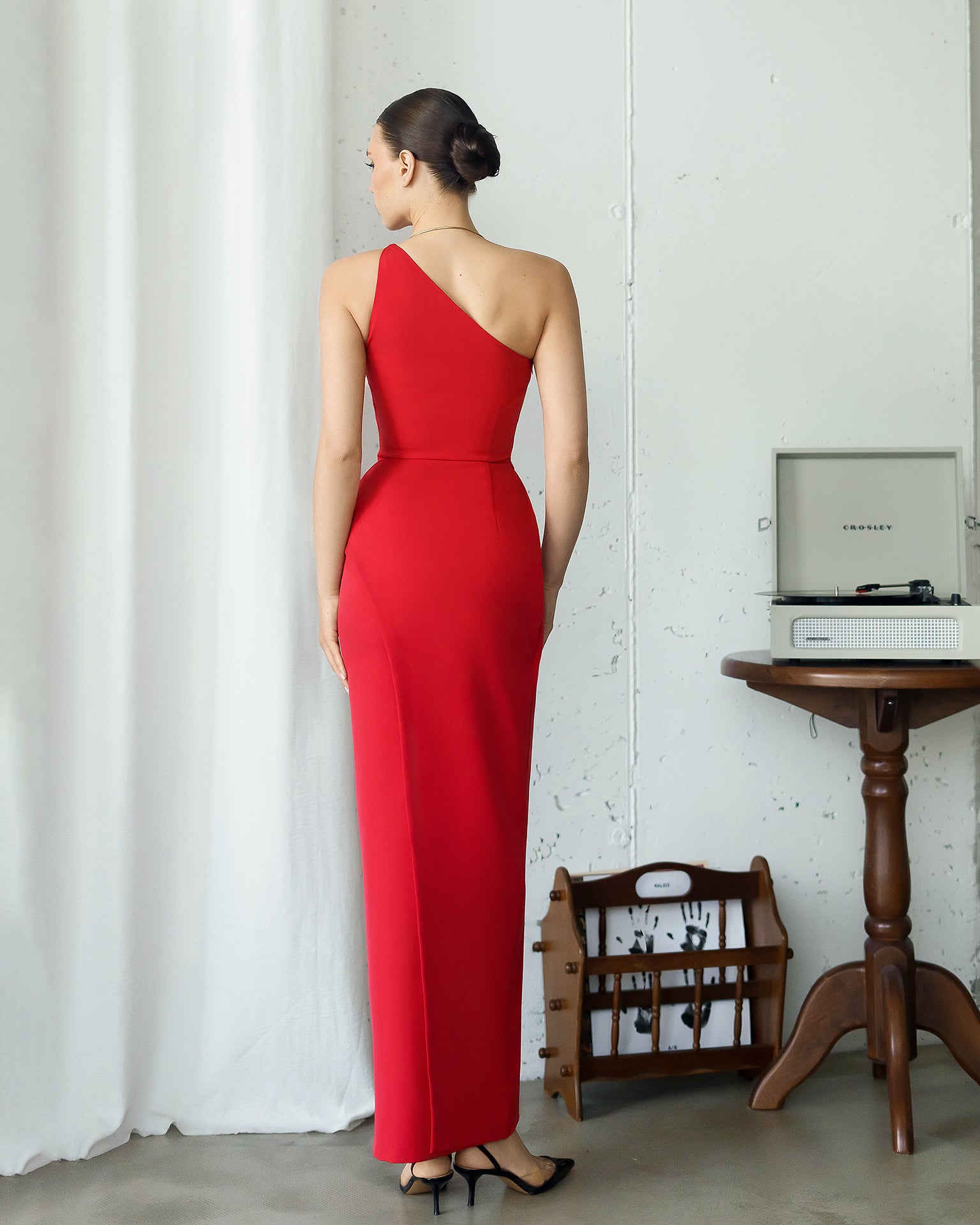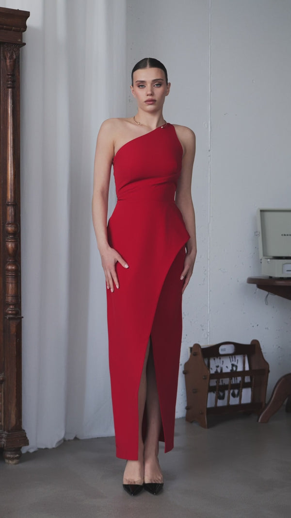 The AURORA ONE SHOULDER DRESS delivers red-carpet drama with architectural finesse. Tailored from premium diagonal suiting crepe, its sculpted single-strap bodice wraps the torso and flows into an asymmetric skirt finished with a thigh-high slit for confident stride. An internal waist seam defines the figure while maintaining a clean, modern line—just add minimalist heels and luminous jewels to let Aurora shine.