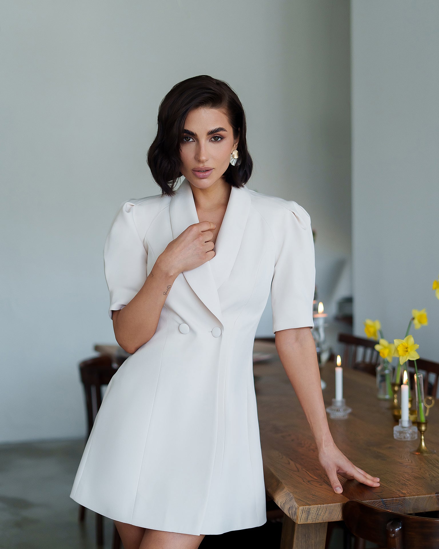 The CLAIRE DRESS is a refined mini silhouette with timeless tailoring and confident charm. Crafted from premium diagonal suiting crepe, it features a structured blazer-inspired cut with soft puffed sleeves and a defined waist. The double-breasted closure and notched lapel add an air of sophistication, while the dense lining ensures a flawless fit. Perfect for day-to-night dressing, cocktail events, or modern business occasions, the CLAIRE DRESS brings polish to every step.
