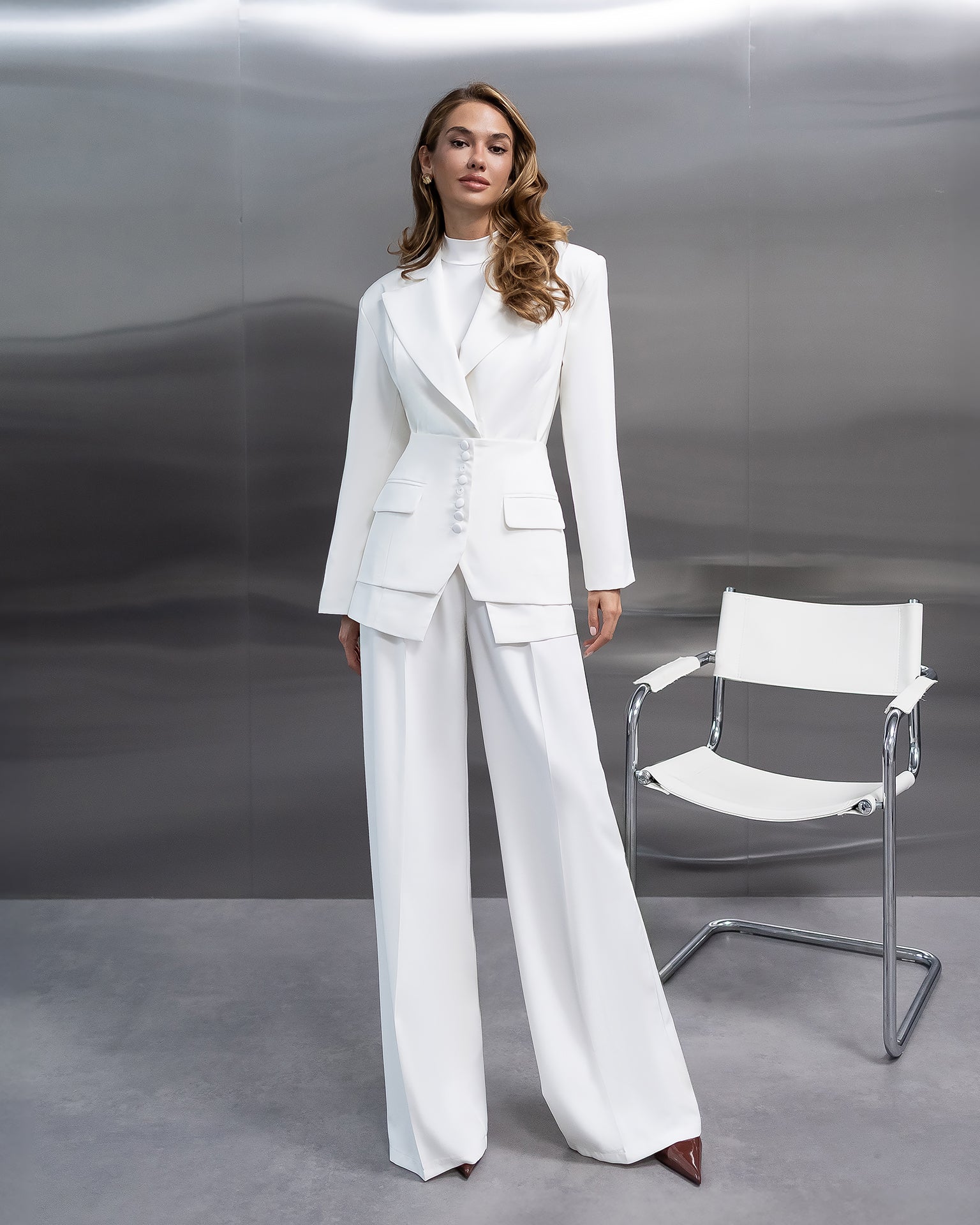 El traje de novia Marquelle encarna la sofisticación atemporal y la feminidad estructurada. Con un blazer entallado con elegantes botones forrados en tela y una cintura peplum definida, acentúa la figura con precisión y gracia. La tela de crepé premium garantiza tanto comodidad como una forma lujosa, haciendo de este traje una declaración de poder refinado en la vestimenta.