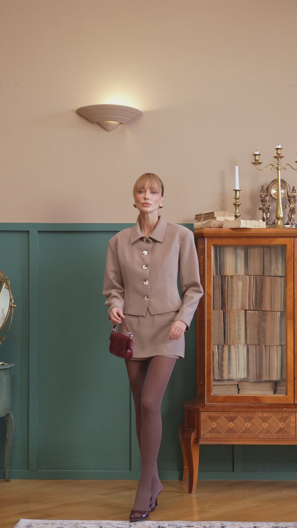 Novera suit is a refined two-piece set consisting of a lined fitted jacket and elegant skirt-shorts. Crafted from dense premium Reno suiting fabric, it holds its shape perfectly, highlights the waistline and creates a smooth, structured silhouette. Ideal for business, everyday or evening looks — modern, sleek and feminine.