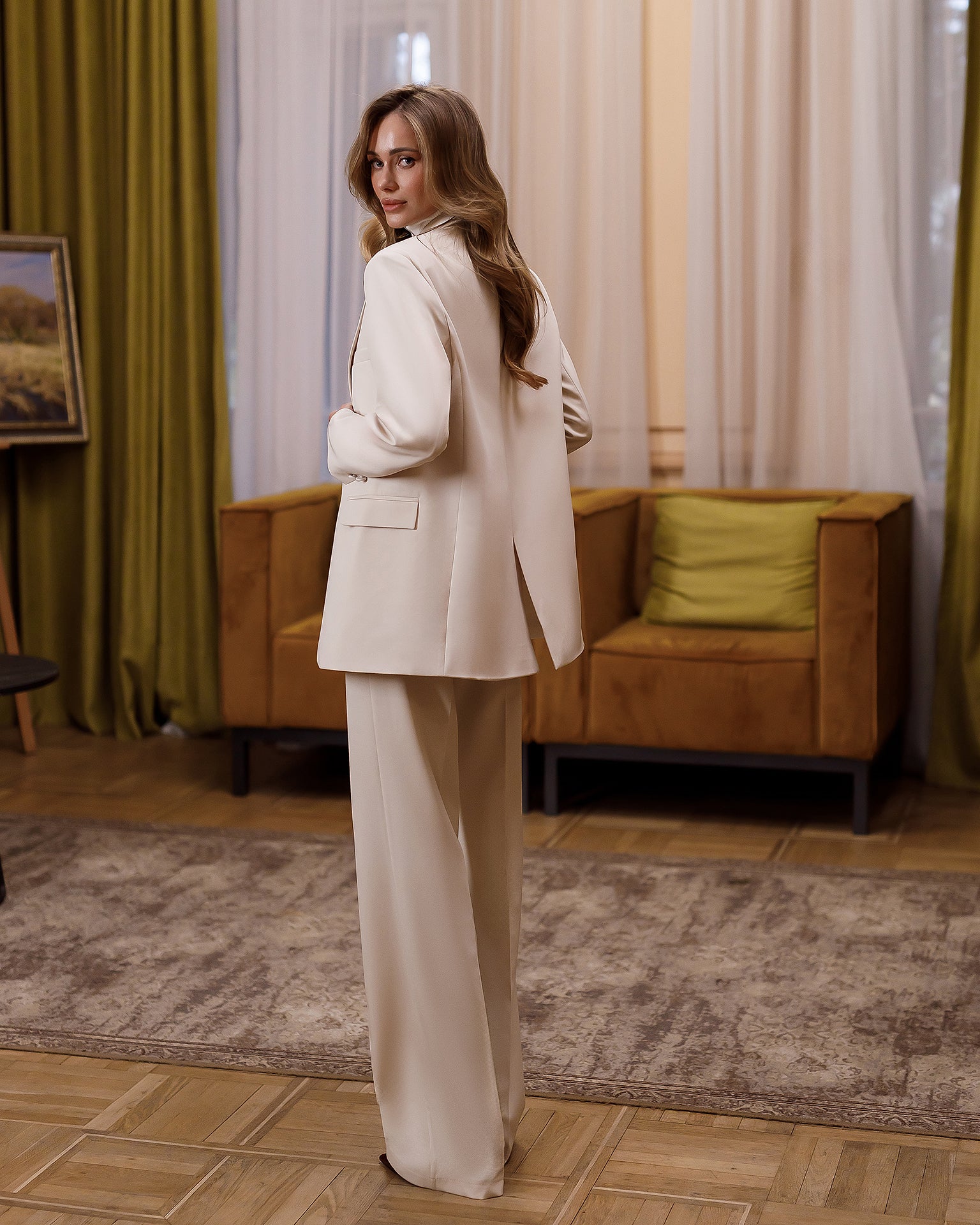 The OPULENCE TWO-PIECE SUIT reimagines classic tailoring in a fluid, feminine key. A softly structured, fully-lined blazer skims the hips with a single-button wrap closure and sharp notched lapels, while the high-rise, wide-leg trousers fan to the floor for an elongated silhouette. Cut from premium viscose diagonal suiting crepe, the set moves effortlessly from boardroom to brunch and everywhere in between. Style the pieces together for head-turning polish or mix and match with denim and dresses for endless wardrobe mileage.