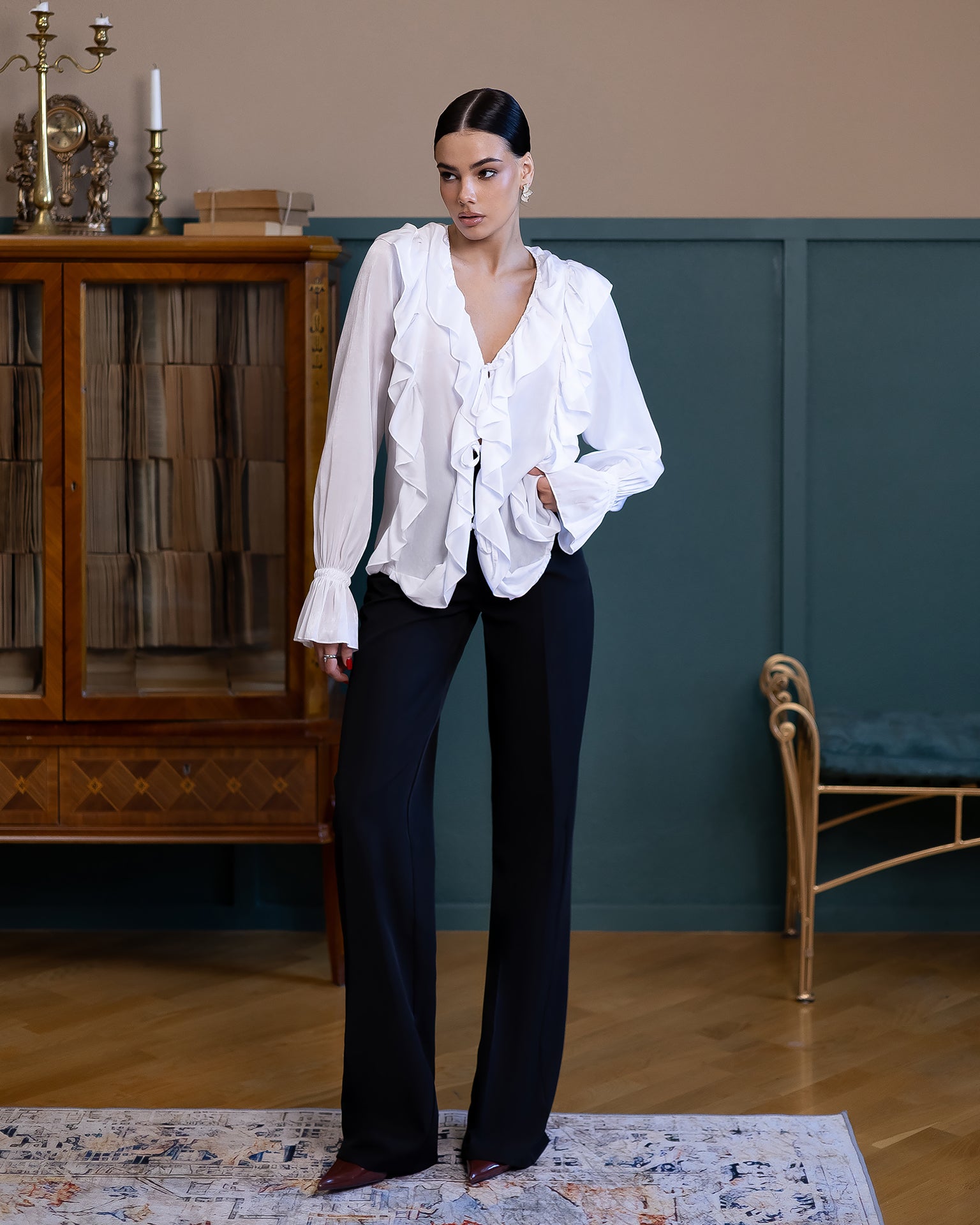 Orletta is an elegant blouse made of delicate tencel voile. The design features soft cascading ruffles along the neckline and front line, voluminous sleeves with gathered cuffs, and a flowing silhouette that drapes beautifully on the body. Lightweight, feminine, and luxurious — perfect for both evening looks and refined daytime outfits.