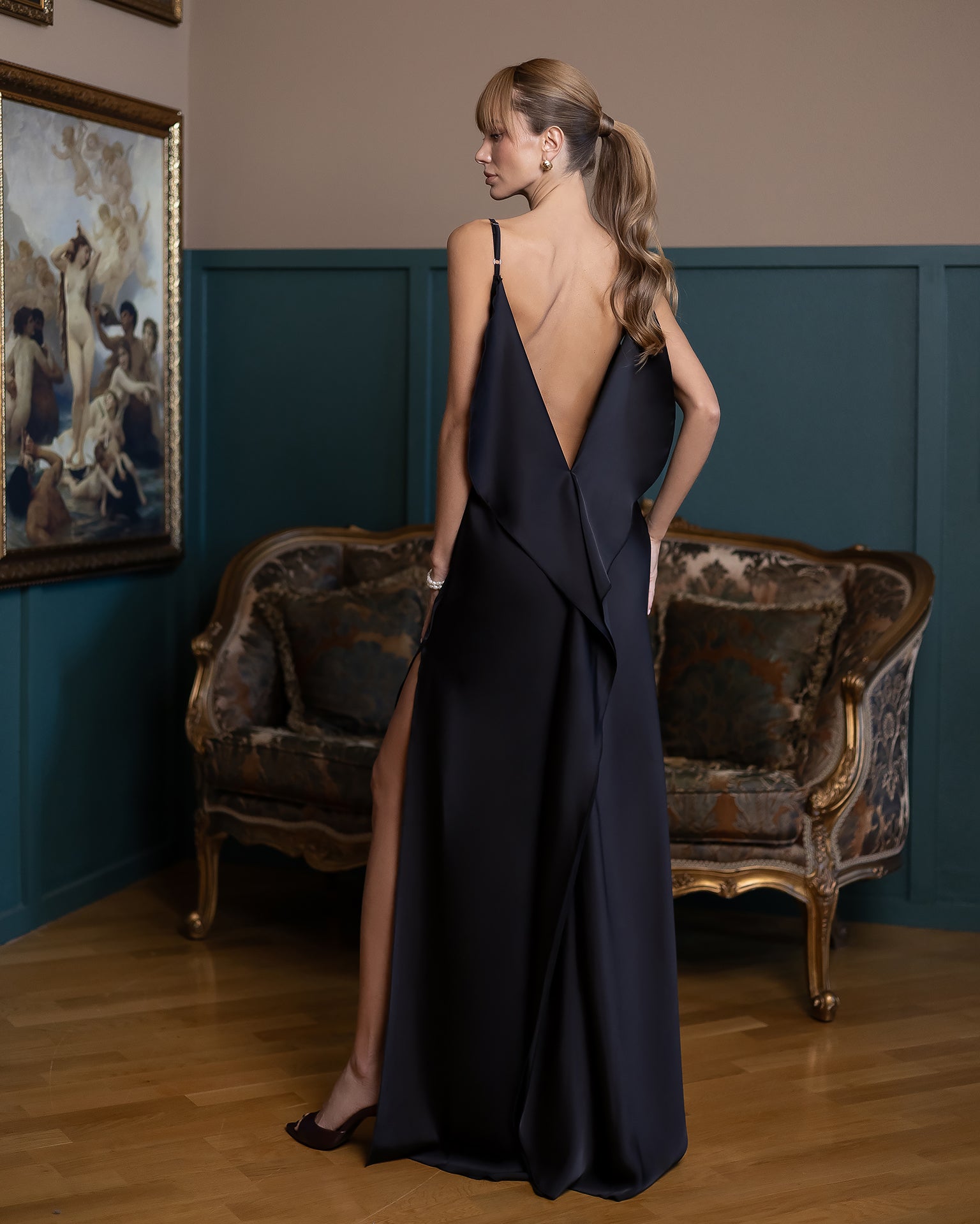 Cut on the bias from double-faced premium satin, the LUMINA CASCADE GOWN drapes fluidly over the figure, catching the light with every step. A soft cowl neckline melts into slender rouleau straps that frame an open back, where an attached scarf panel falls in a liquid ribbon to the hem. A thigh-high slit adds movement and allure, while the clean side zip keeps the silhouette seamless. Effortlessly elegant for black-tie weddings, red-carpet moments and sunset soirées alike.