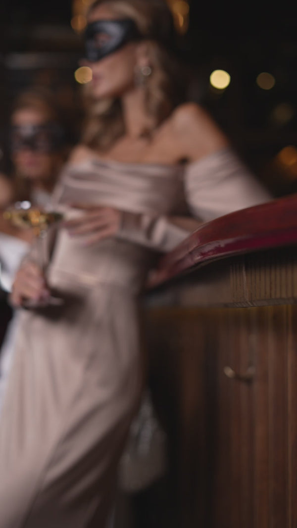 Luneria Gown — an exquisite off-shoulder maxi silhouette crafted from dense premium Mango satin, offering a sculpted fit through the bodice and a fluid, elongated skirt. The draped neckline softly frames the shoulders, while fitted sleeves accentuate the elegance of the upper line. The satin texture enhances every movement with a refined glow, creating a luxurious evening presence.