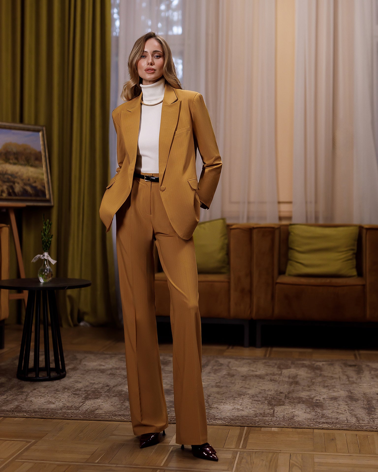 The OPULENCE TWO-PIECE SUIT reimagines classic tailoring in a fluid, feminine key. A softly structured, fully-lined blazer skims the hips with a single-button wrap closure and sharp notched lapels, while the high-rise, wide-leg trousers fan to the floor for an elongated silhouette. Cut from premium viscose diagonal suiting crepe, the set moves effortlessly from boardroom to brunch and everywhere in between. Style the pieces together for head-turning polish or mix and match with denim and dresses for endless wardrobe mileage.