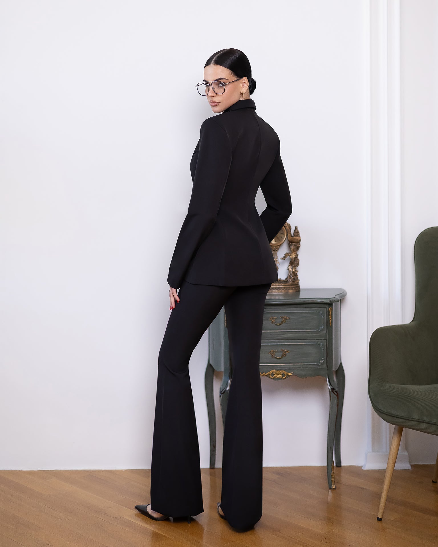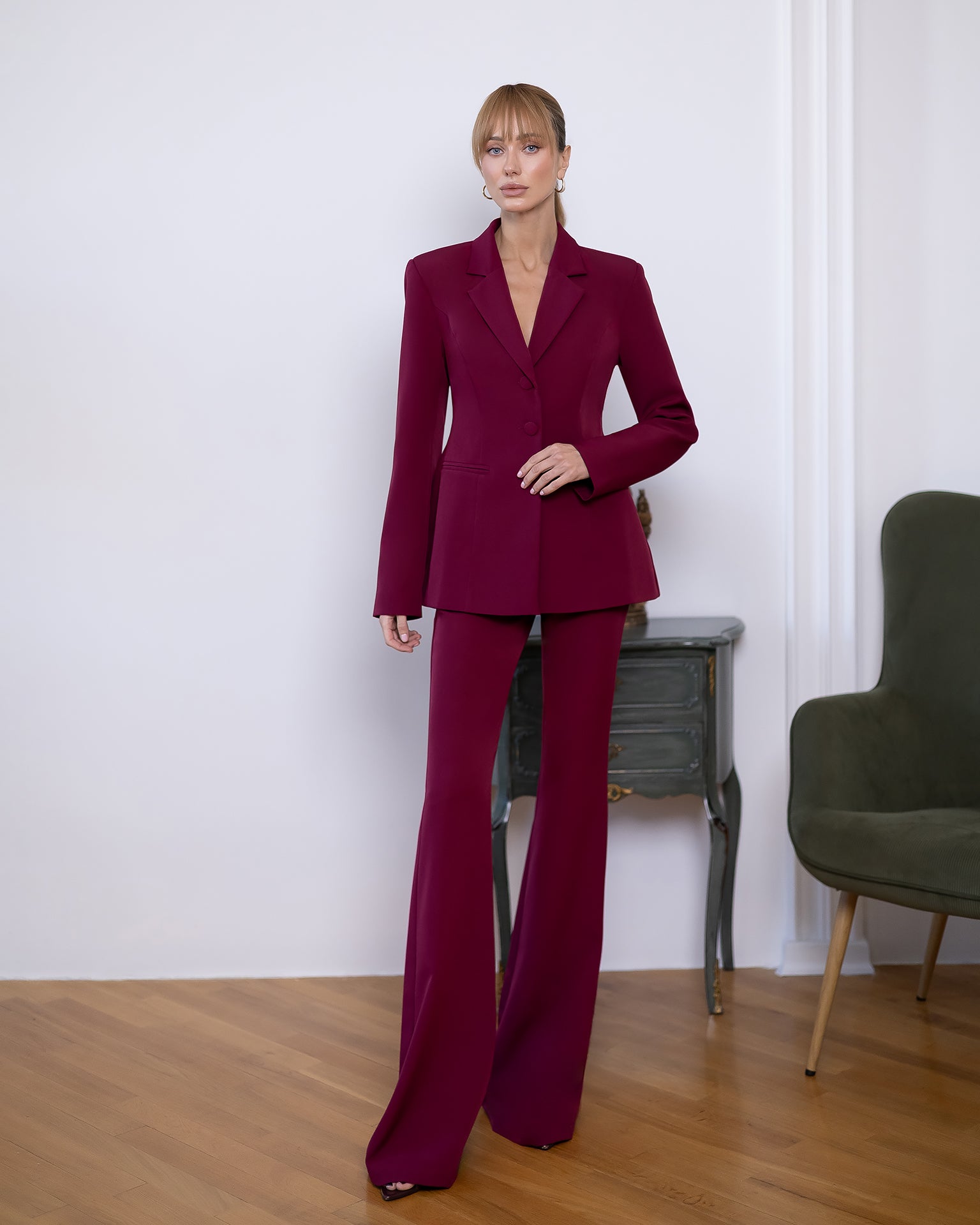 Le costume Portofino Flare allie une coupe impeccable à une silhouette élancée. Le blazer à simple boutonnage sculpte la taille grâce à des pinces nettes, des revers à pointe et une doublure intégrale lisse pour une structure parfaite. Le pantalon flare taille haute assorti allonge la jambe avec un pli marqué et un tombé fluide — assez élégant pour les événements, assez puissant pour les réunions de direction.