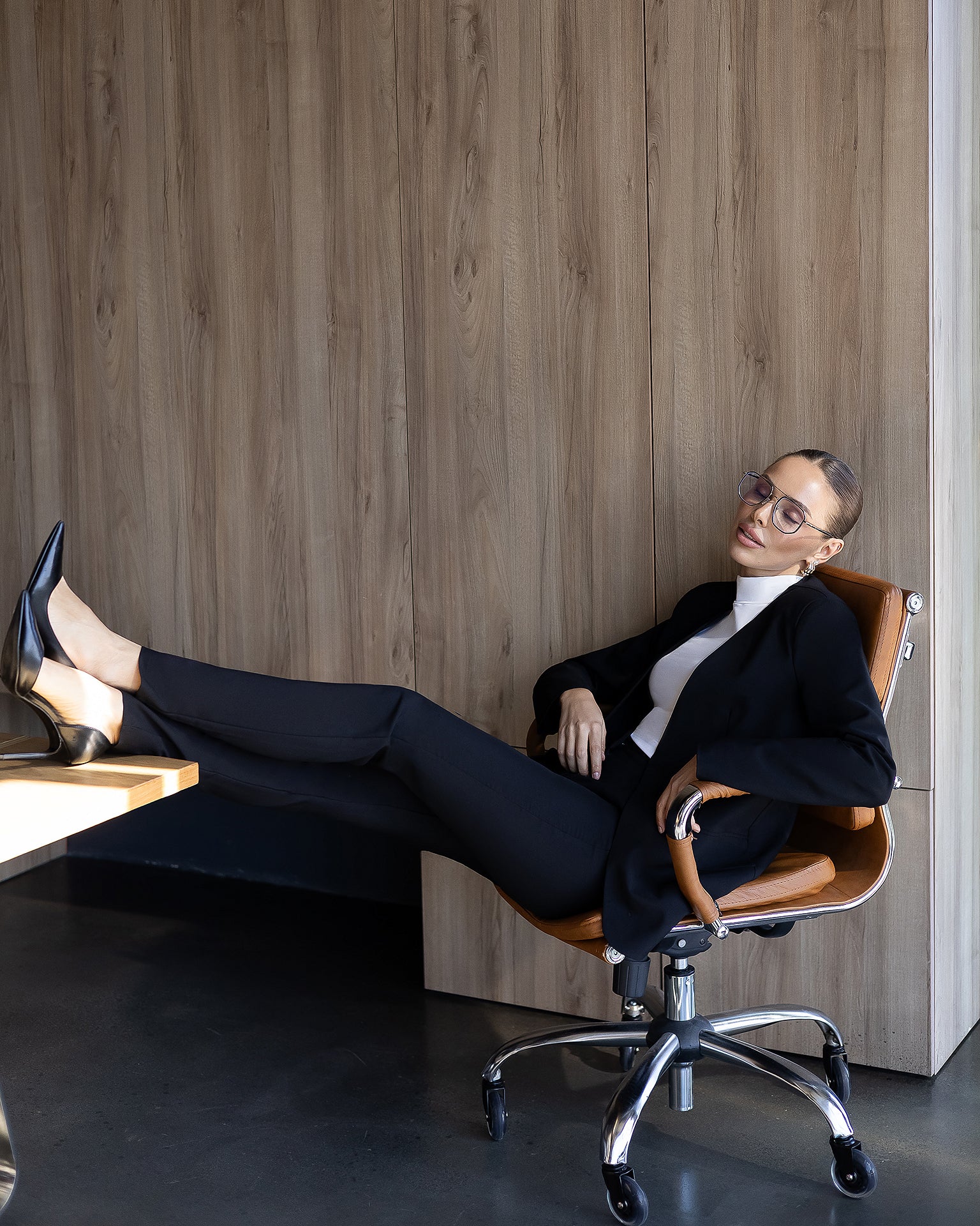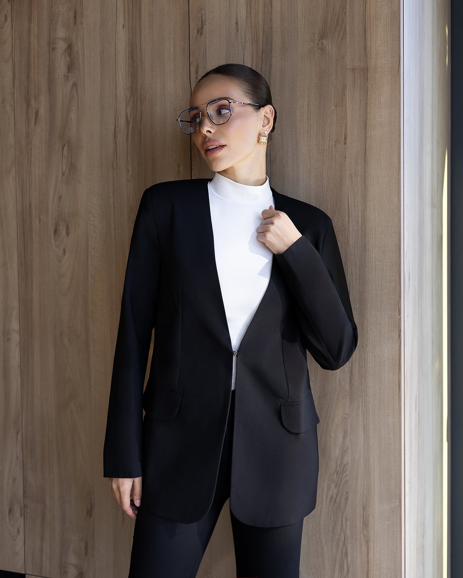 Le costume Arden incarne une élégance raffinée et un minimalisme moderne. Le blazer sans col crée une silhouette épurée et structurée, tandis que le pantalon slim met en valeur la silhouette féminine.