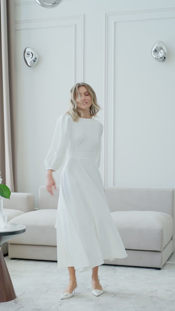 The VALERIE MIDI DRESS pairs timeless sophistication with an unexpected open-back twist. Sculpted ¾-length puff sleeves balance a clean bateau neckline, while a fitted bodice releases into a fluid A-line skirt that skims the calves for effortless movement. A subtle back cut-out fastens with covered buttons and a self-tie sash, offering an adjustable, waist-defining finish. Cut from premium diagonal suiting crepe, the dress holds its architectural shape yet feels light and breathable—ideal for weddings, cocktail hours, or any occasion that calls for understated drama.