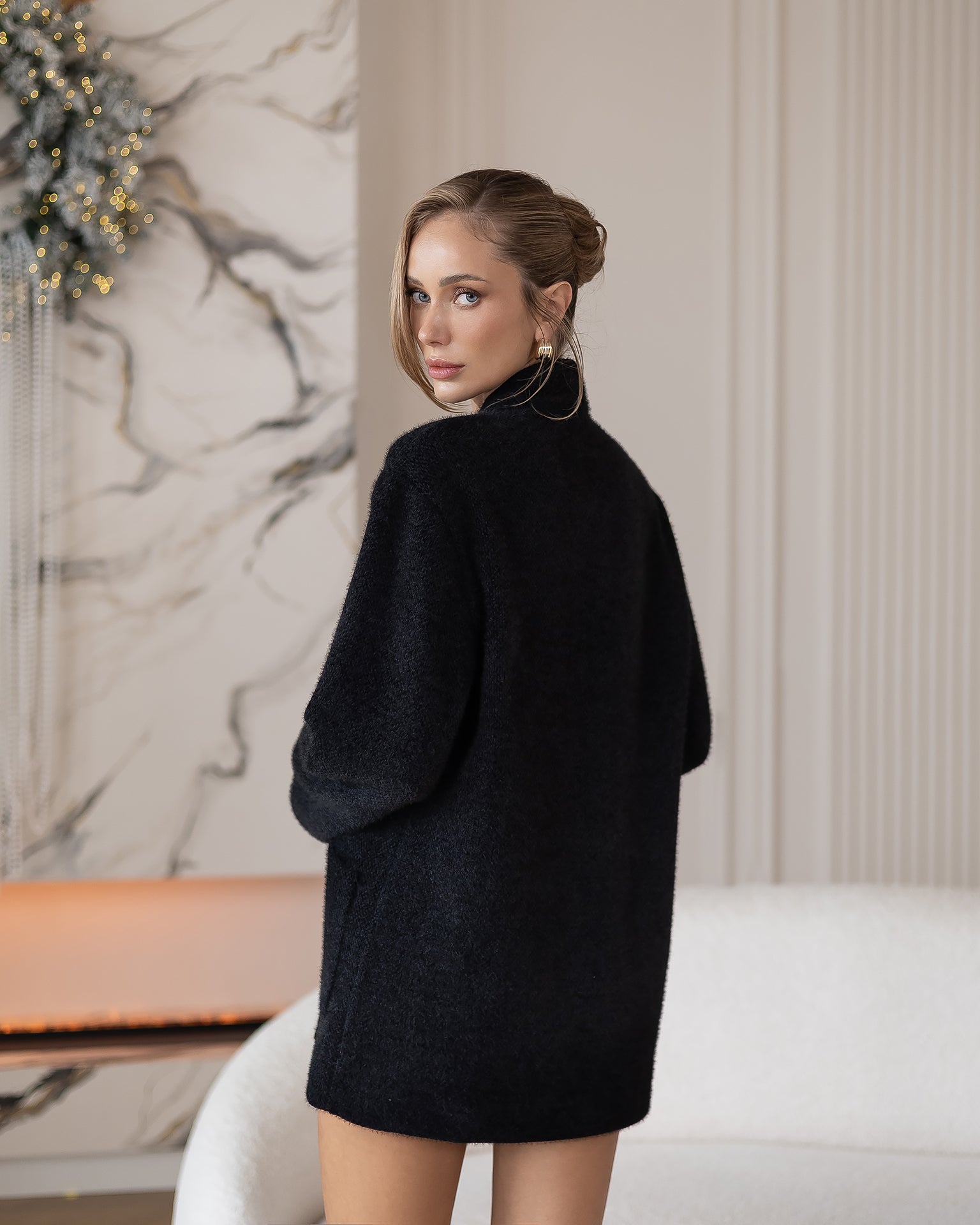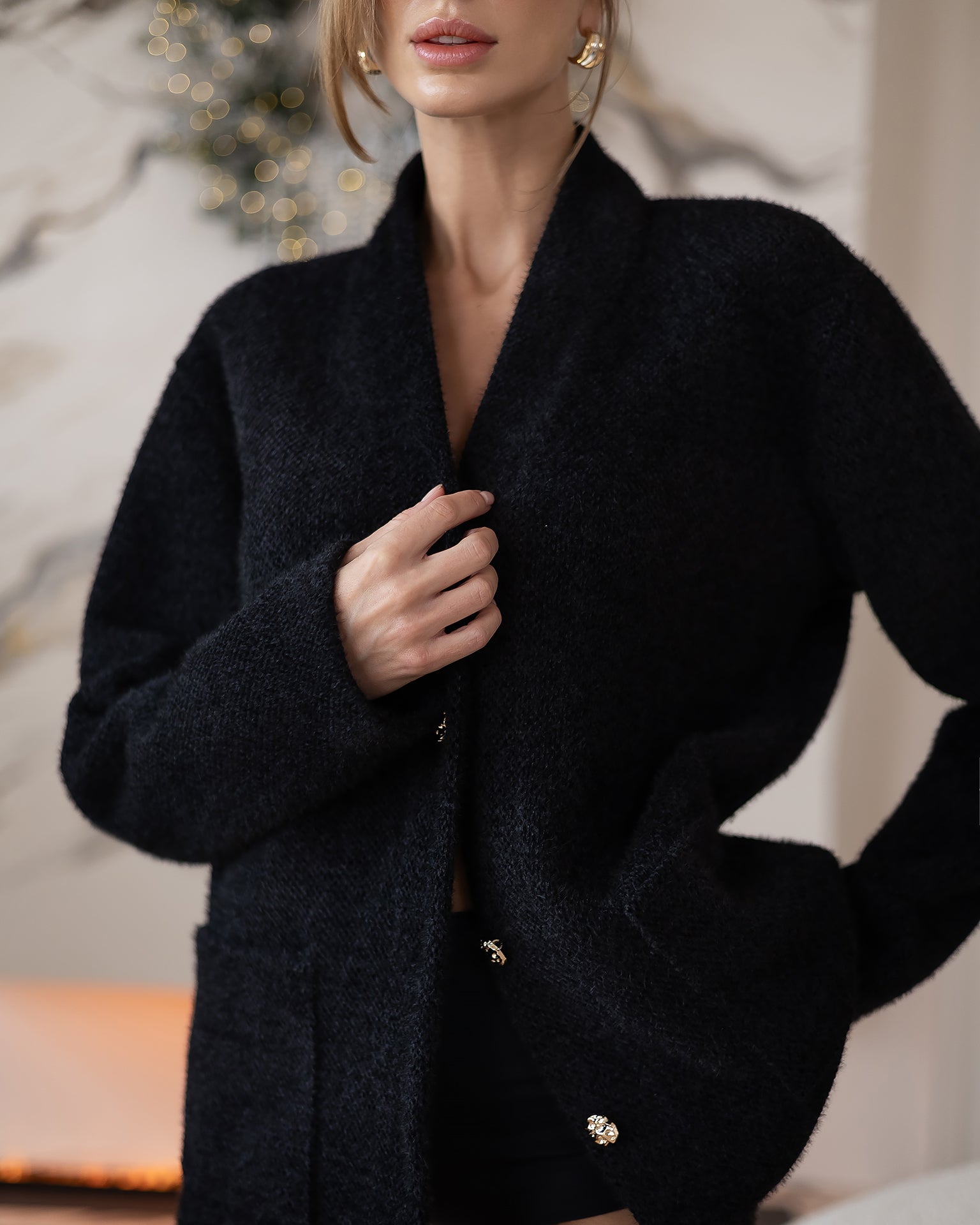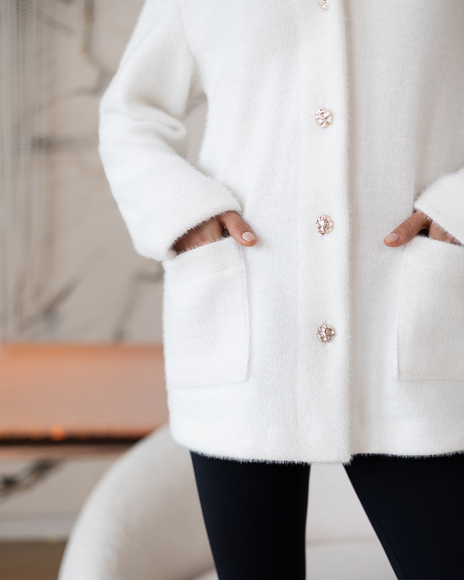 Merluna Cardigan — a soft, plush knit design crafted from Silva fabric, offering a warm, cloud-like feel with a refined, relaxed silhouette. Decorative buttons and oversized pockets add a touch of understated luxury, making it perfect for elevated everyday styling.