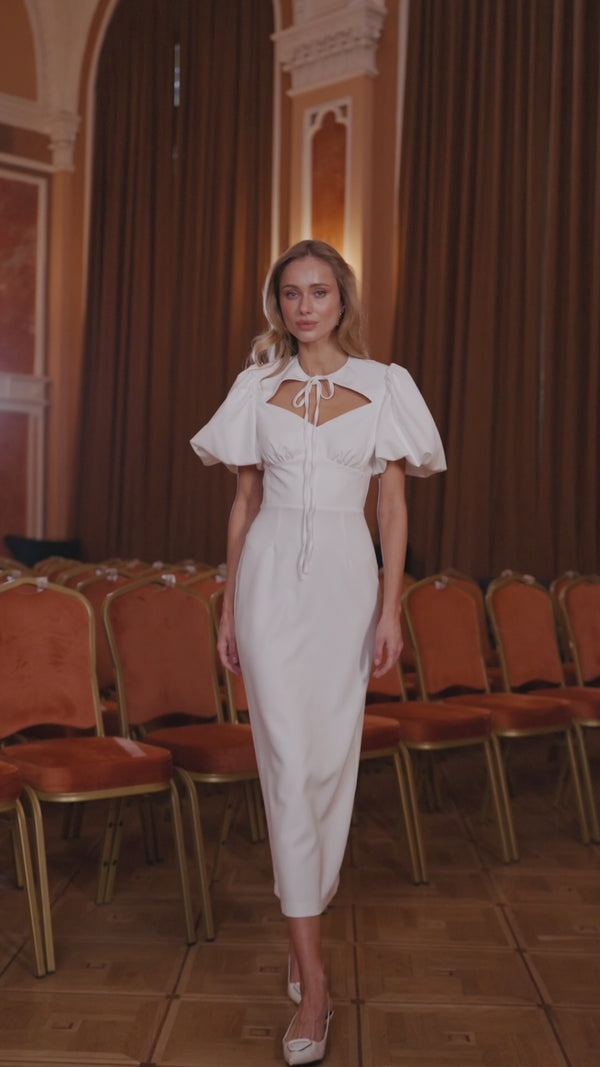 The Mirella Bridal Midi Dress is a sophisticated, sculpting silhouette crafted from premium diagonal crepe. Featuring a feminine cut-out neckline, adjustable tie detail, and dramatic puff sleeves, this dress creates an elegant hourglass figure while maintaining comfort and structure. The midi length adds refinement, making it perfect for evening events, celebrations, and formal occasions. High-quality tailoring ensures a flawless fit and luxurious look.