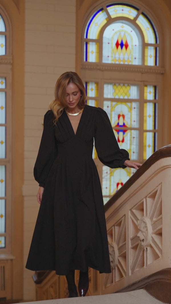 A sophisticated midi dress created to emphasize feminine elegance. The design features a fitted waist, a flowing skirt, and voluminous long sleeves gathered at the cuffs. Made from premium dense diagonal crepe, the fabric holds its shape perfectly while draping smoothly. A refined V-neckline adds a graceful touch, making the Amelia Dress ideal for events, special evenings, and celebrations.
