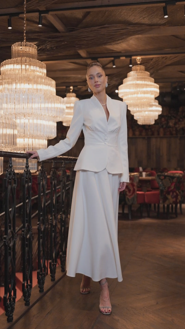 The elegant Anselia Bridal Suit features a tailored blazer with long sleeves and a flowing A-line midi skirt. Designed to accentuate the waist, it creates a refined and feminine look — perfect for both business occasions and special events.