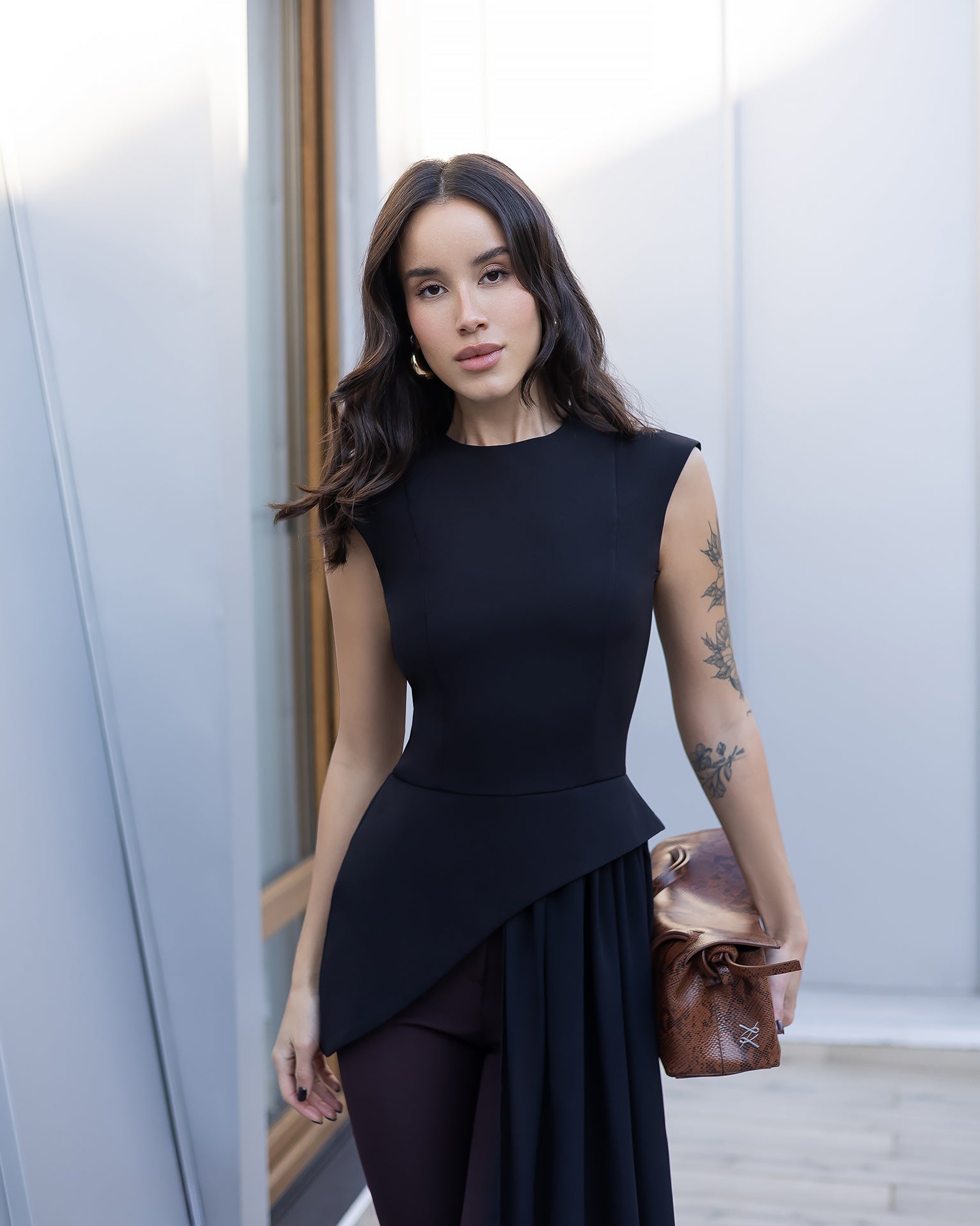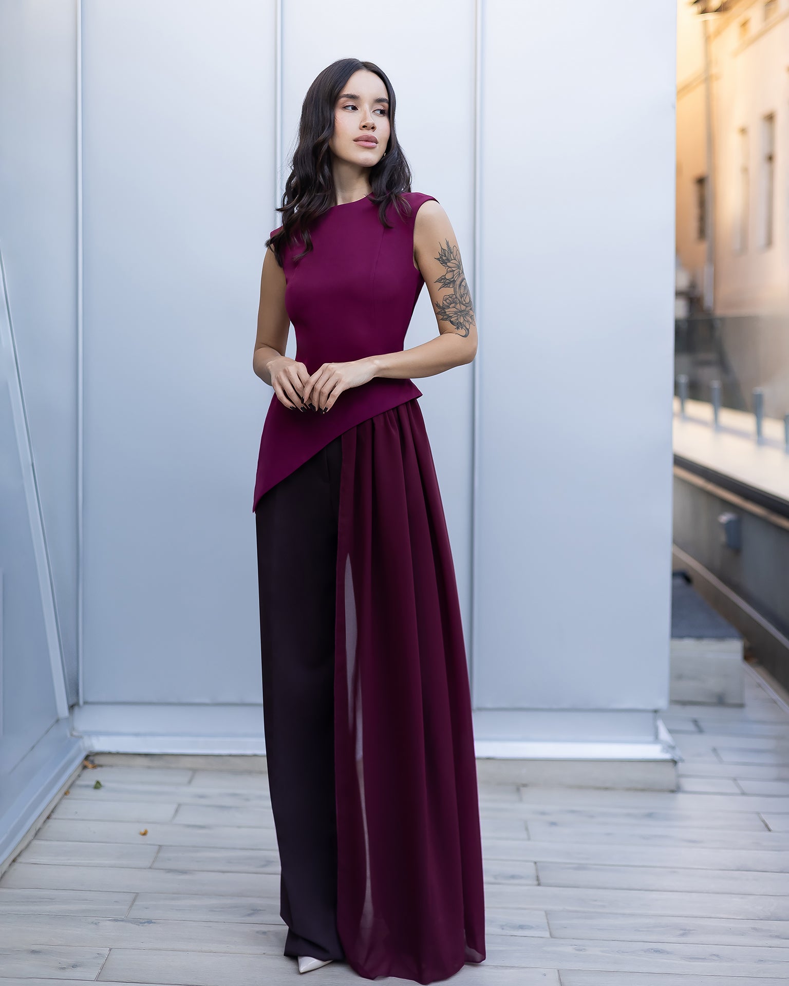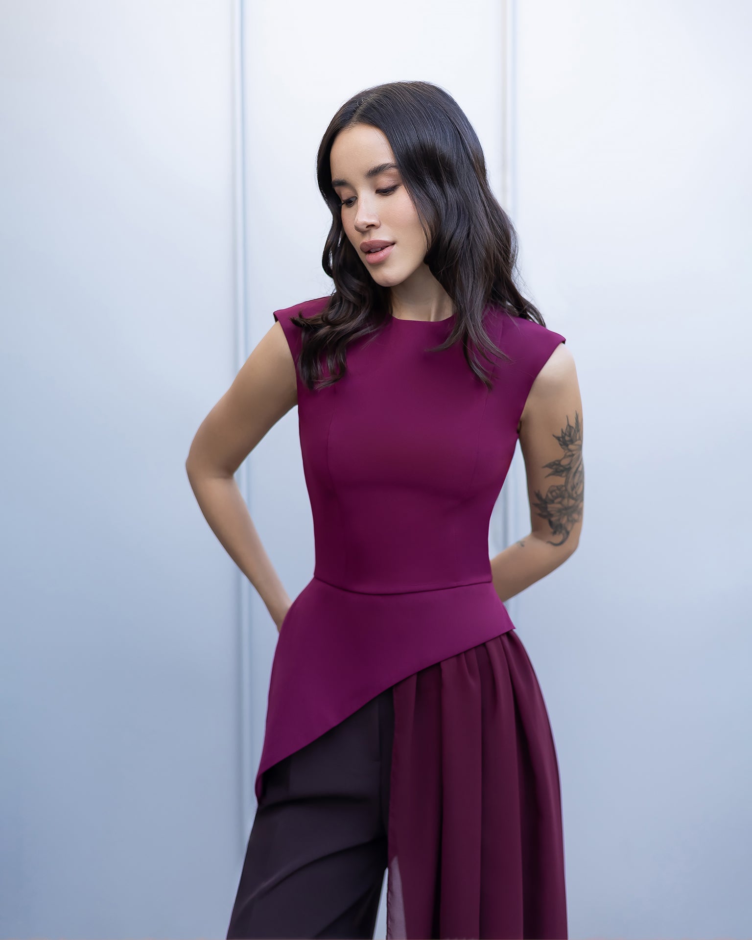 The Ceora Top is an elegant and modern piece that stands out with its sharp lines and refined silhouette. Accented with chiffon detailing, it brings a delicate, feminine touch — perfect for special occasions or stylish evening looks.