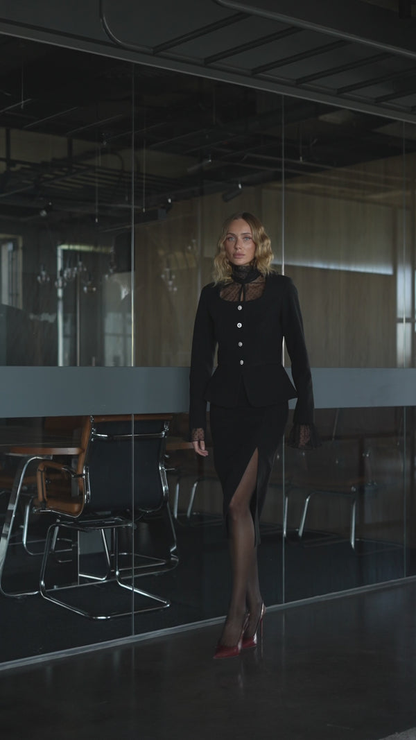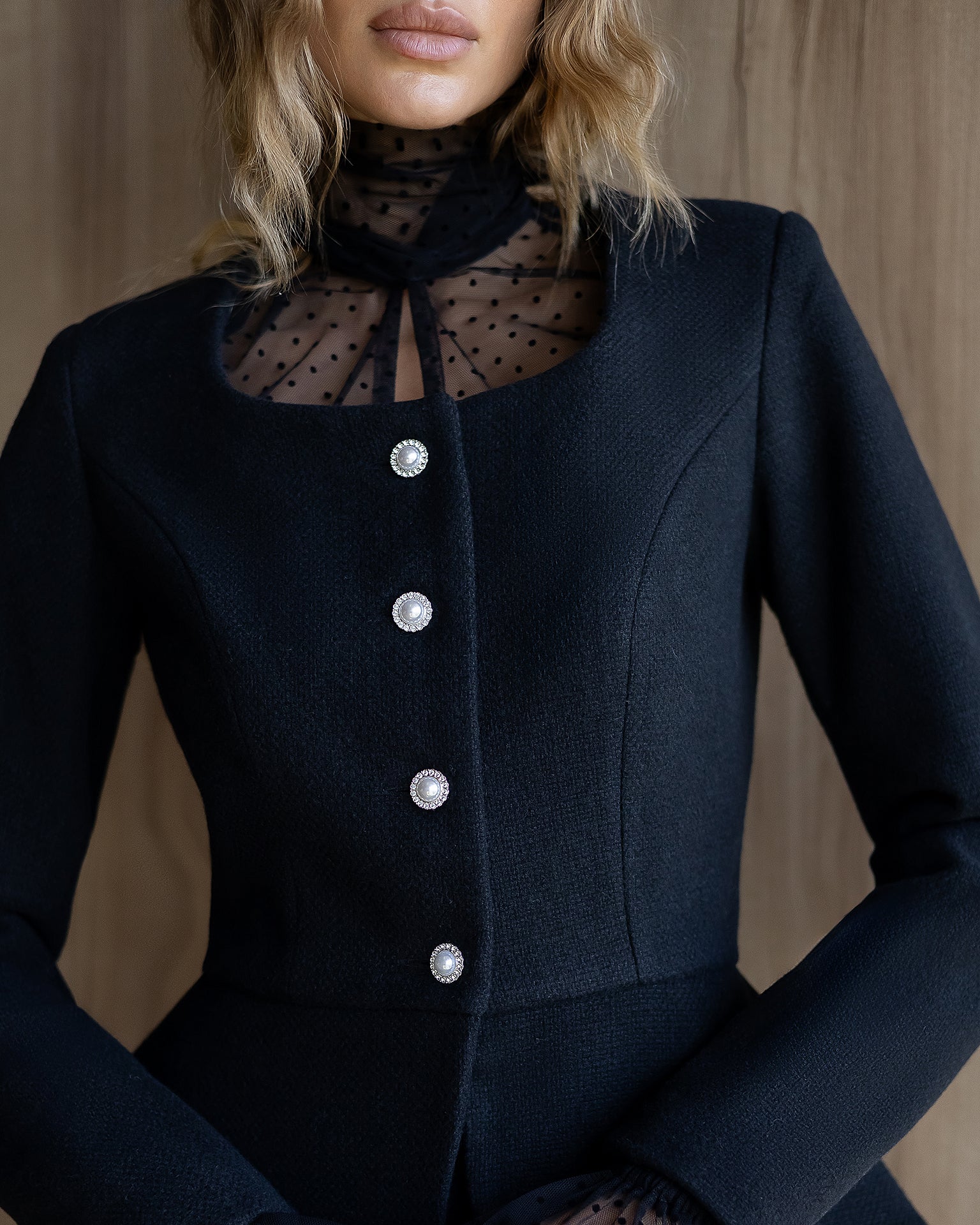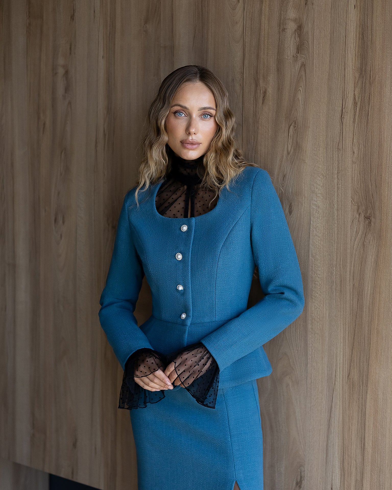Delaria Set is an elegant set consisting of a jacket and a skirt, crafted from dense Chanel-style tweed. The silhouette emphasizes femininity, while the midi length adds sophistication. Lux-class viscose lining ensures comfort and a pleasant touch. A perfect choice for both formal occasions and stylish everyday wear.