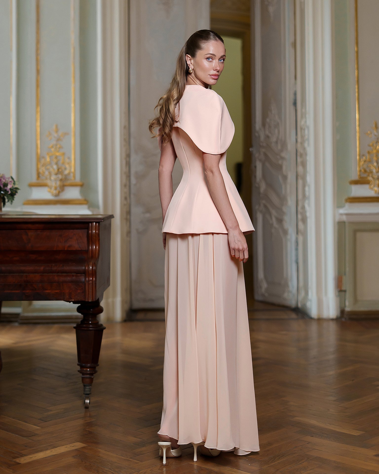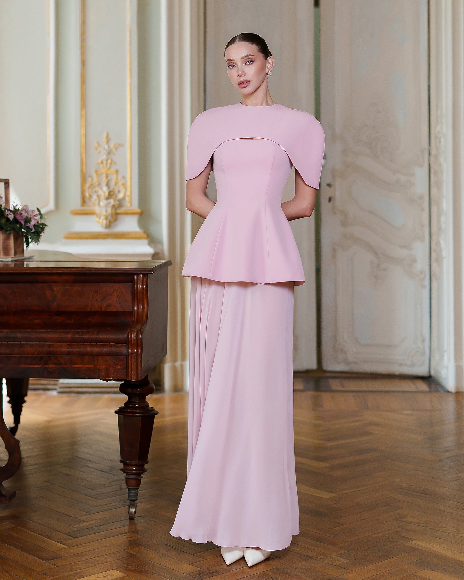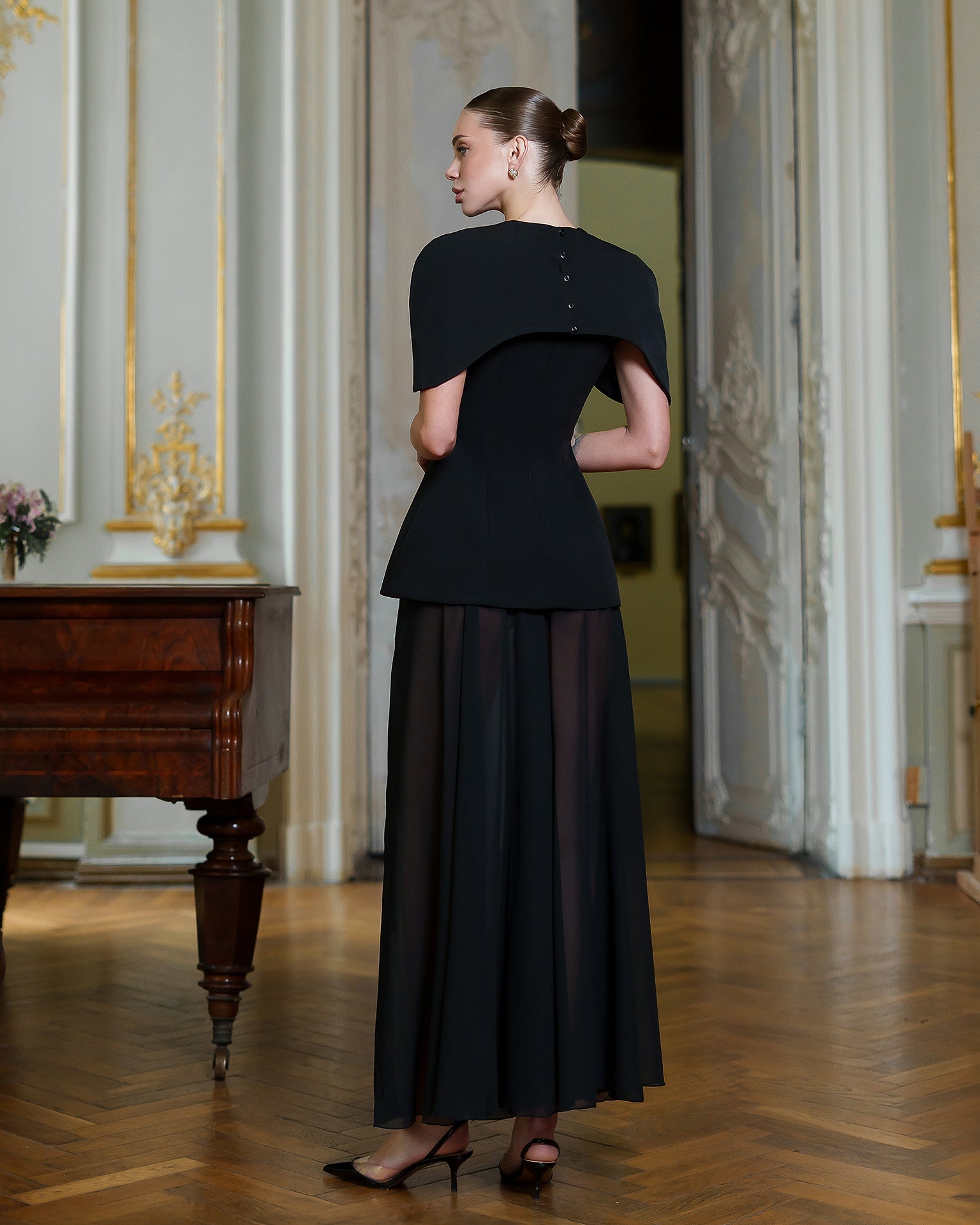The ENIGMA DRESS blends architectural precision with ethereal flair. A sculpted corset bodice in premium diagonal suiting crepe defines the waist and features a dramatic cape-inspired shoulder, while the floor-grazing chiffon skirt adds fluid, semi-sheer movement. The contrasting textures create a striking interplay of structure and softness, perfect for gala evenings, art openings, or any event where statement elegance is essential. Pair with minimalist jewelry to let the silhouette speak for itself.