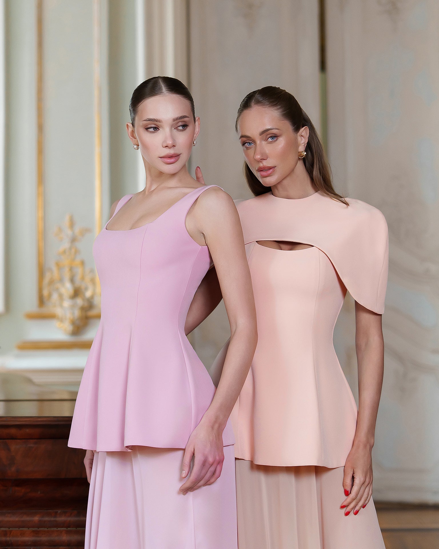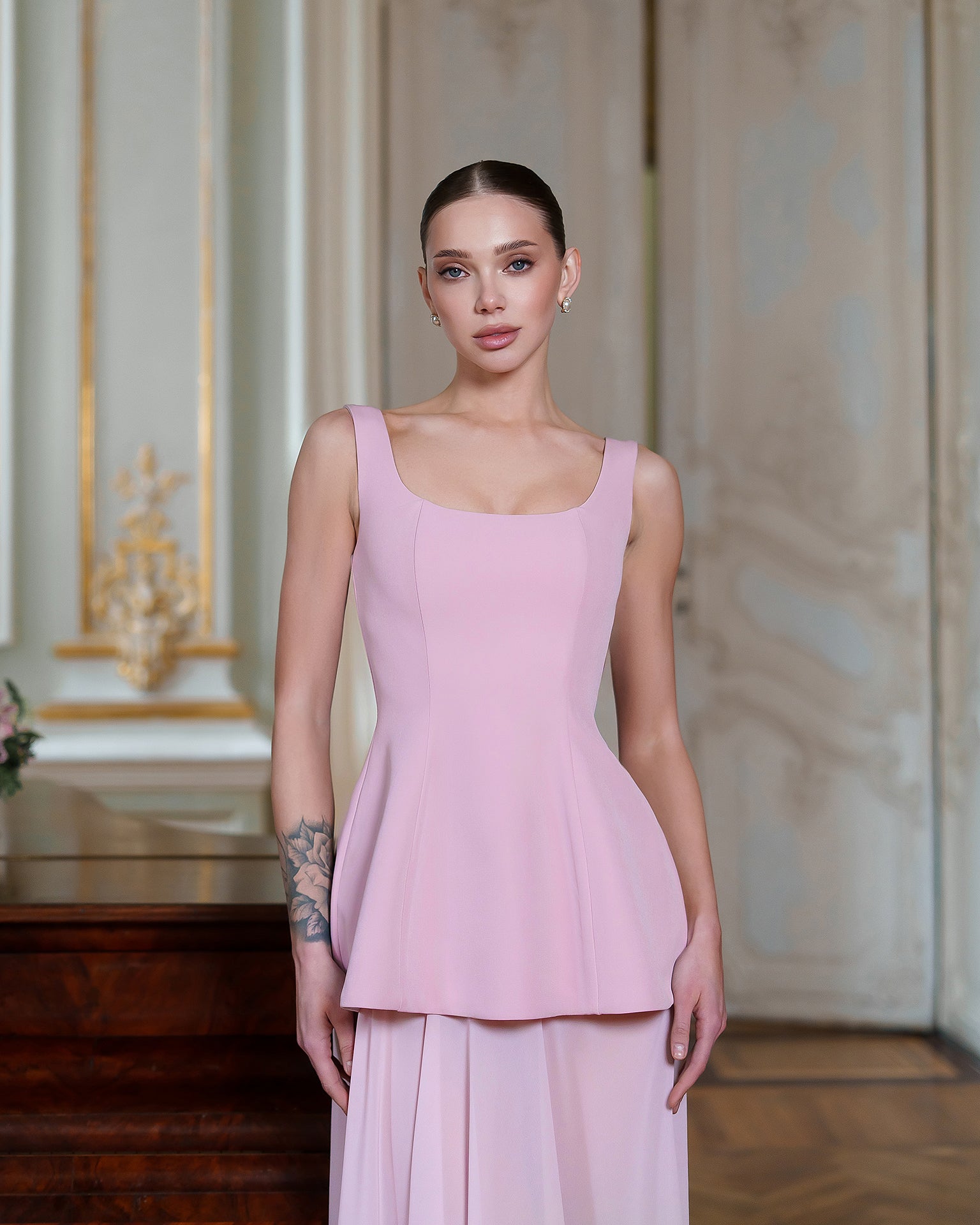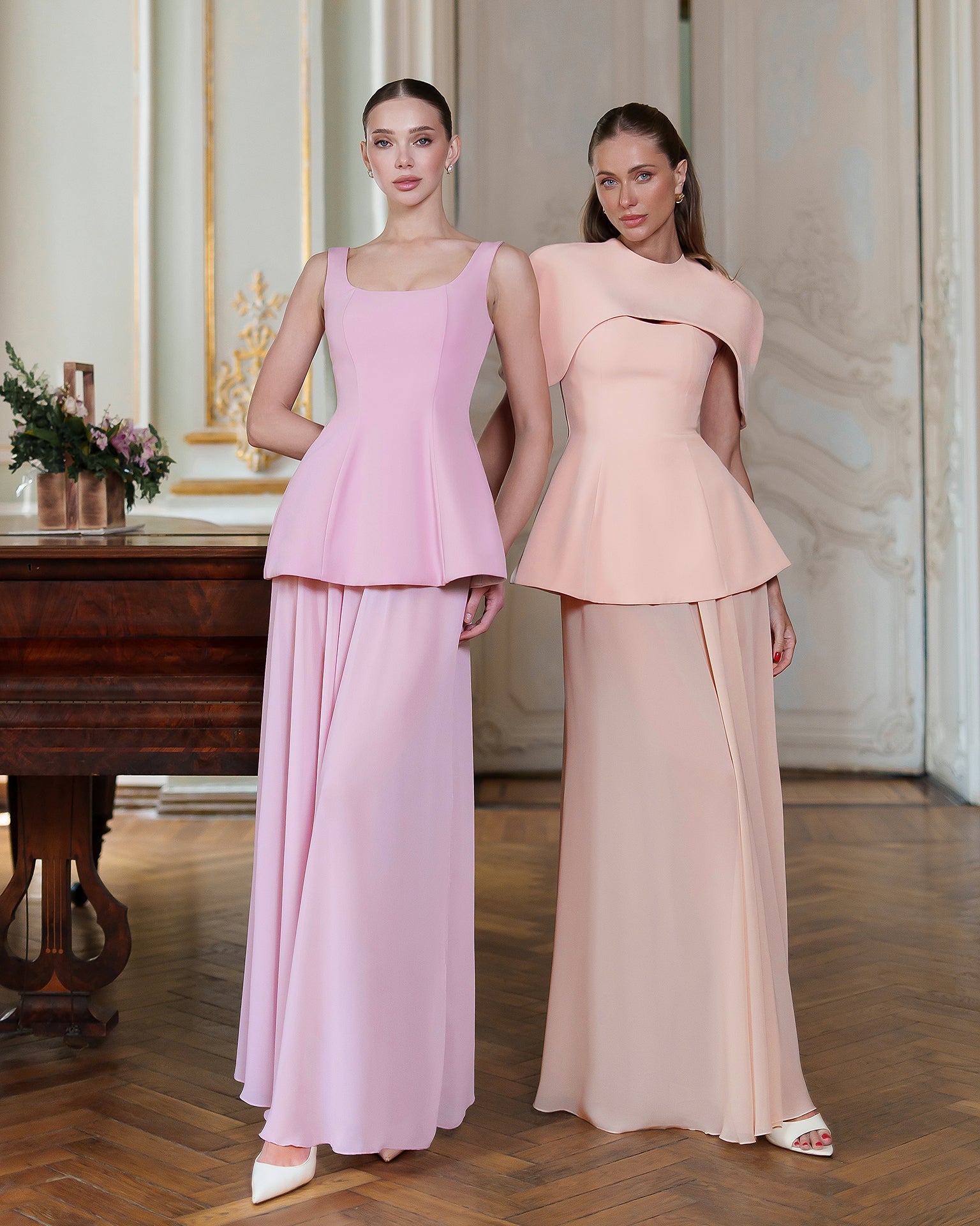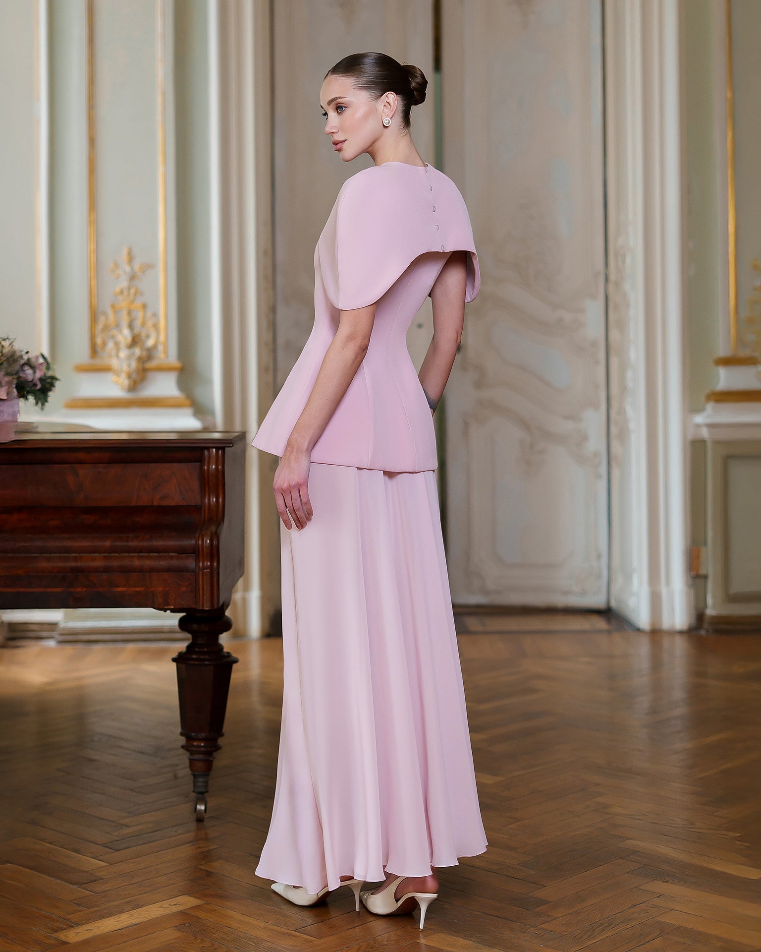 The ENIGMA DRESS blends architectural precision with ethereal flair. A sculpted corset bodice in premium diagonal suiting crepe defines the waist and features a dramatic cape-inspired shoulder, while the floor-grazing chiffon skirt adds fluid, semi-sheer movement. The contrasting textures create a striking interplay of structure and softness, perfect for gala evenings, art openings, or any event where statement elegance is essential. Pair with minimalist jewelry to let the silhouette speak for itself.