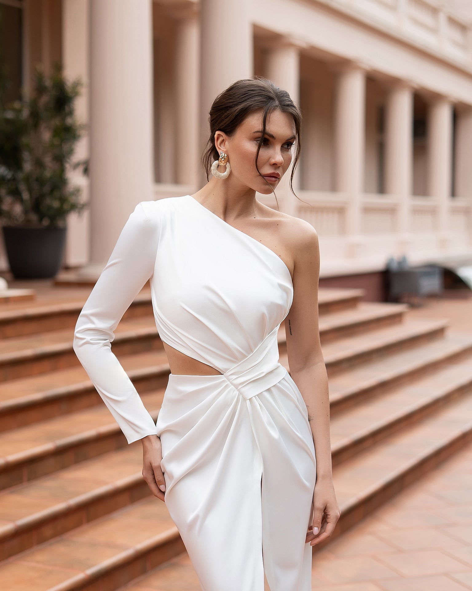 The LAVITA DRESS redefines evening sensuality with architectural precision and a captivating silhouette. Crafted from dense Mango satin, it features a one-shoulder neckline and sculptural draping that contours the waist with a flattering twist. The bold cutout detail and thigh-high slit add a modern, confident edge, while the glossy satin finish elevates the entire look. Ideal for cocktail hours, red carpets, or any evening where elegance meets boldness.
