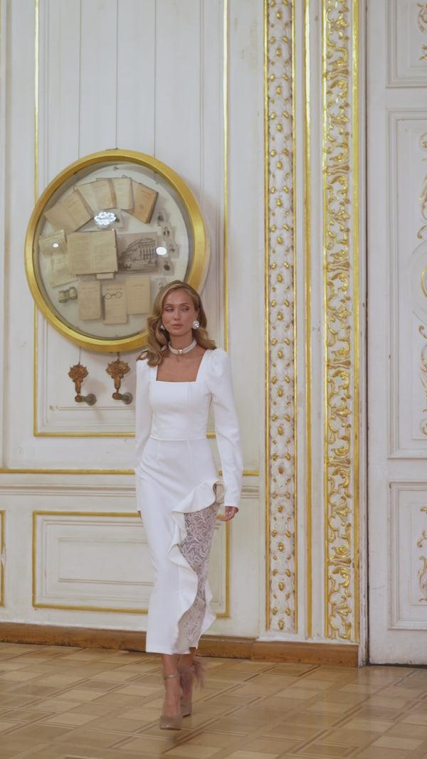 Lysandra Bridal Lace Dress — an elegant midi silhouette crafted from premium diagonal crepe paired with high-quality lace. Sculpted shoulders, a refined square neckline, and cascading ruffles frame the lace insert, creating a sophisticated, couture-inspired evening look.