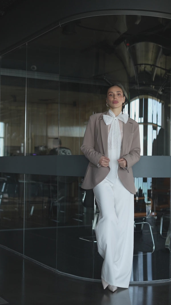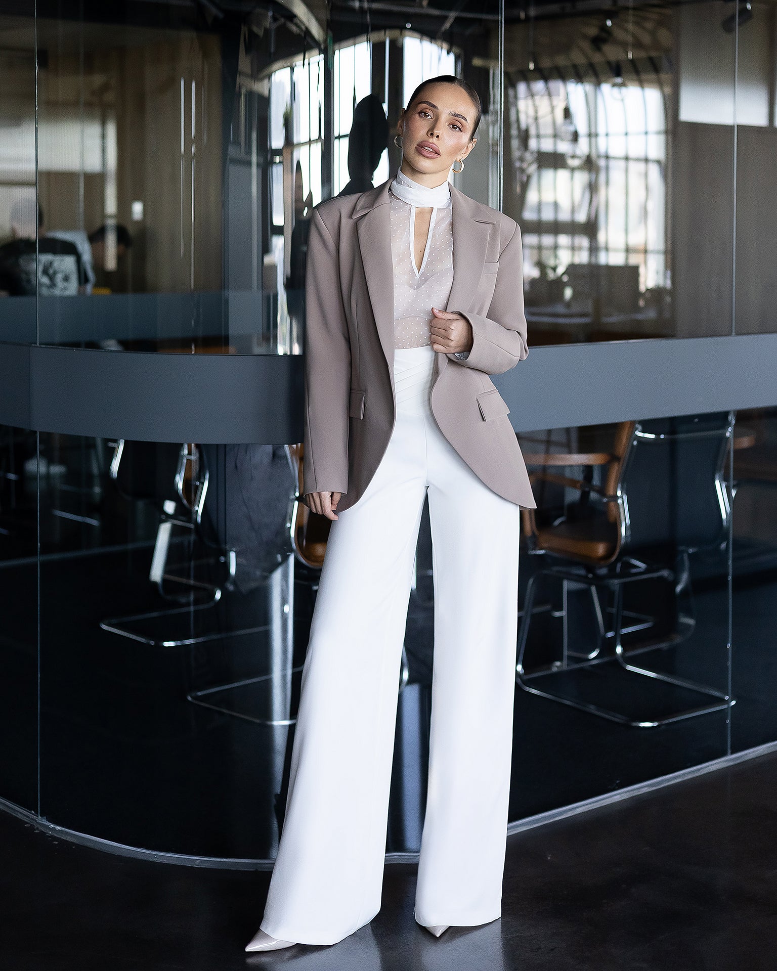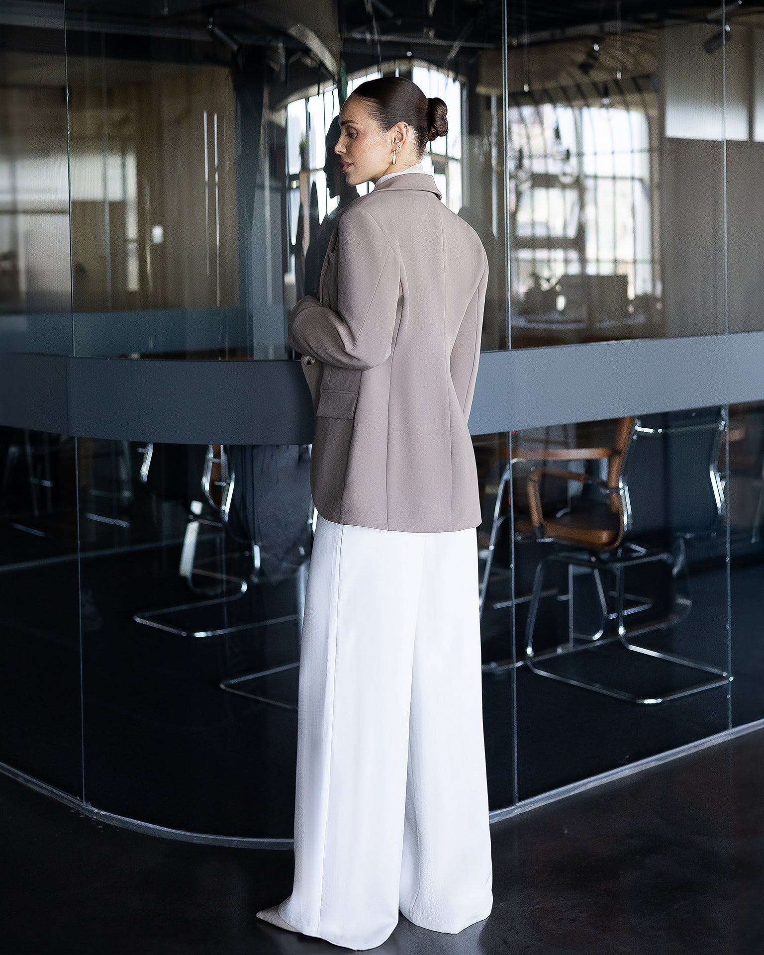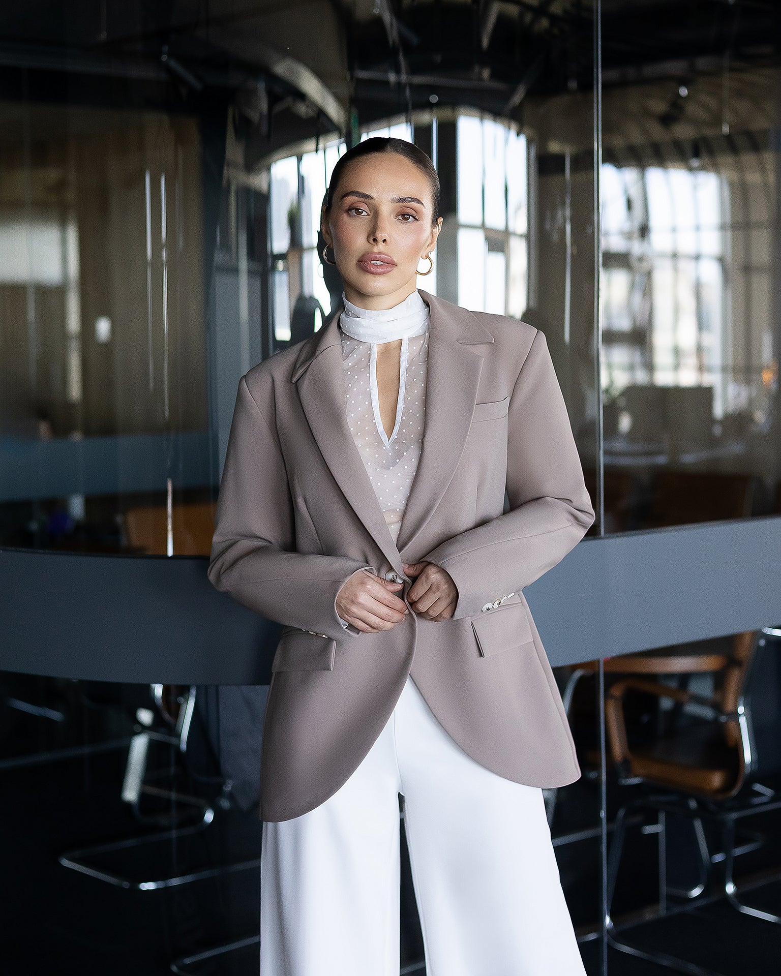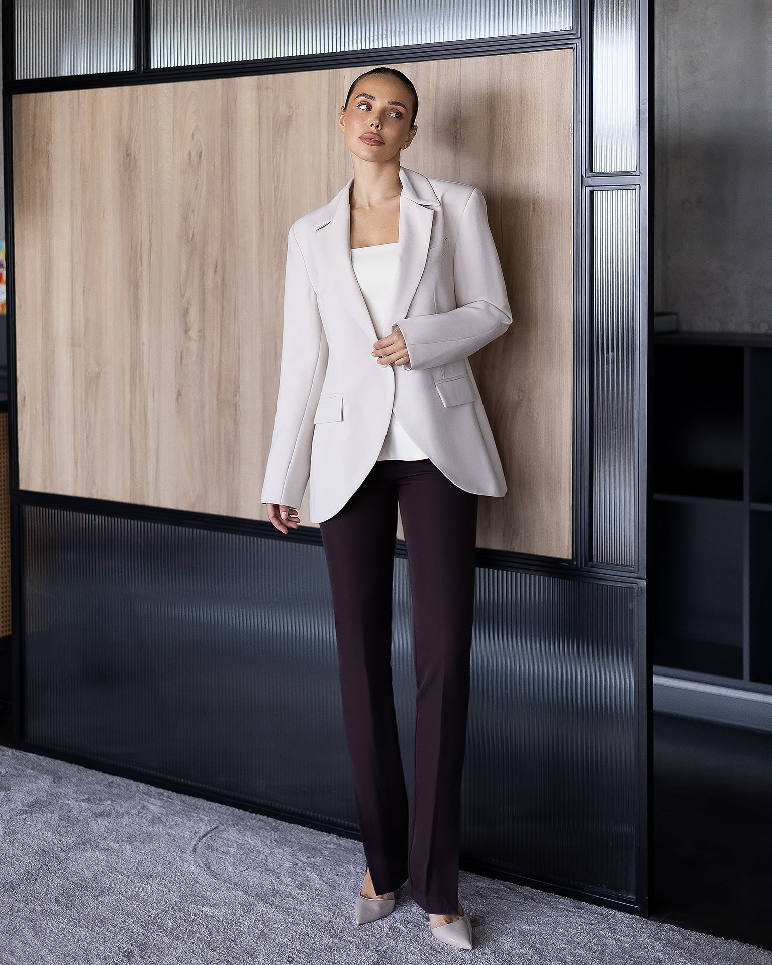 The Renée Blazer is an elegant and refined piece with a perfectly tailored silhouette that combines sophistication and modern structure. Its sculpted cut with a curved hemline elongates the figure, creating a flawless fit. Made from premium Reno suiting fabric with a dense lining, it ensures both comfort and durability. Perfect to pair with classic trousers for a chic total-look.