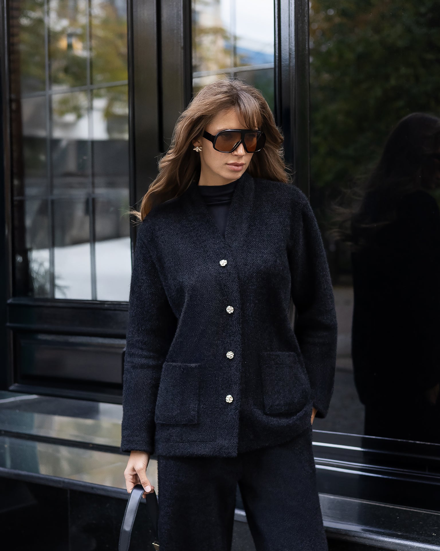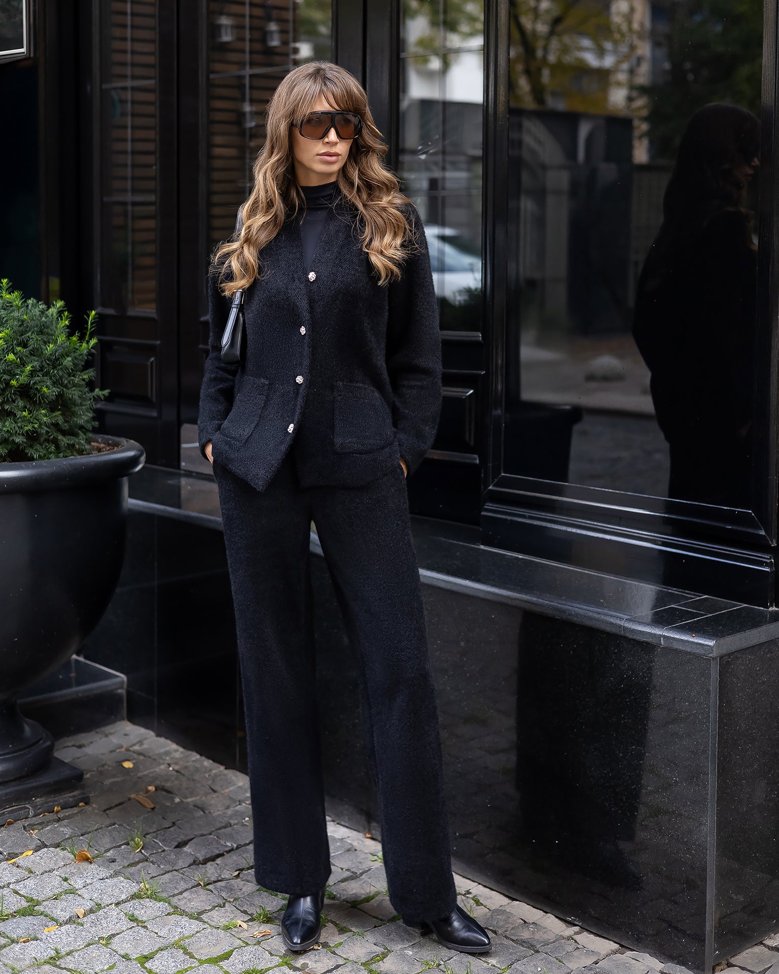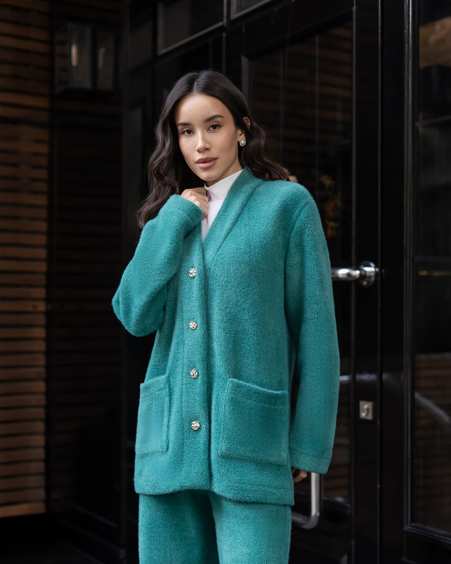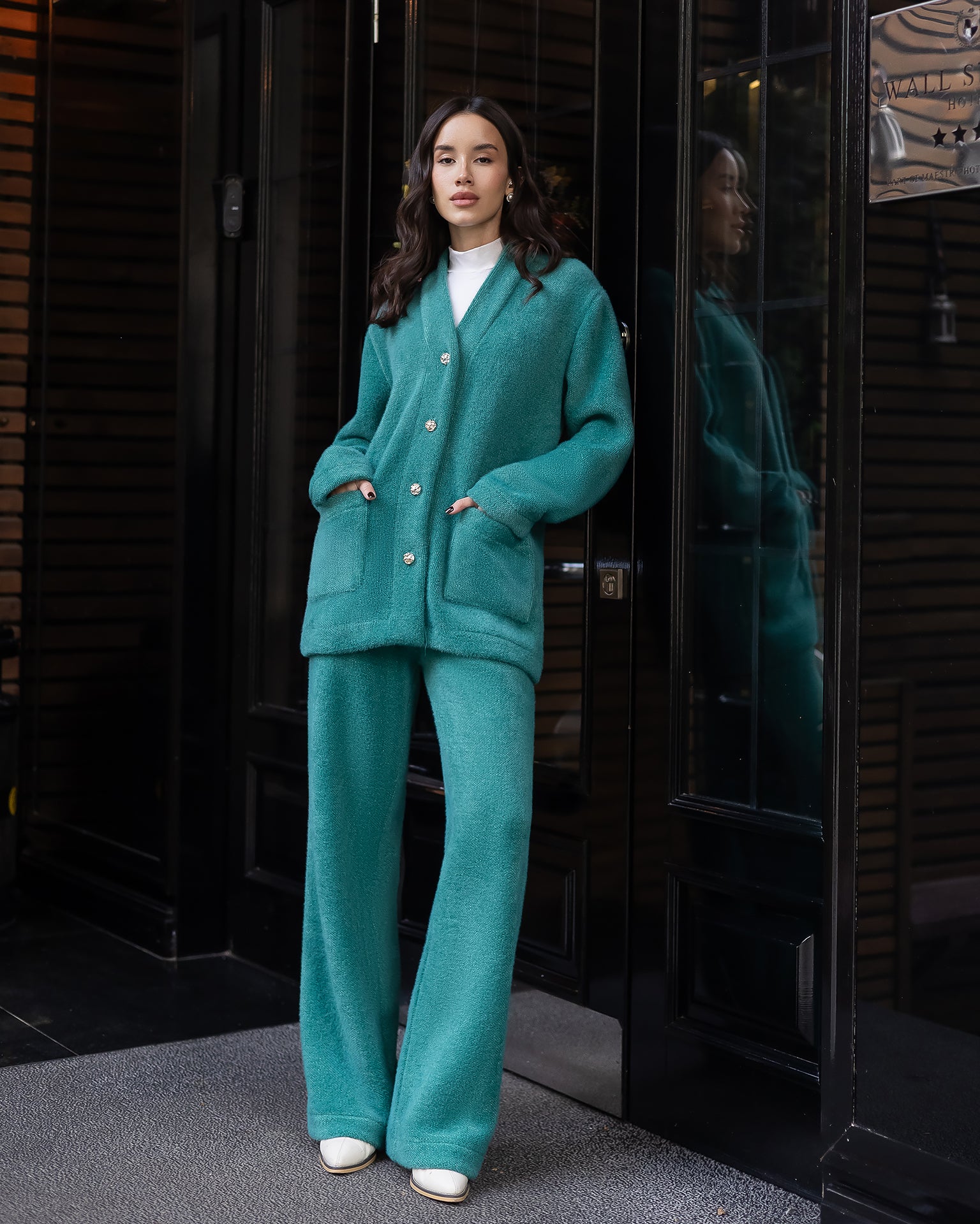 Silvenza Set — a cozy two-piece ensemble crafted from exceptionally soft, plush Silva fabric. The relaxed cardigan with signature statement buttons pairs with wide-leg trousers, creating an elevated yet comfort-driven look perfect for everyday luxury.