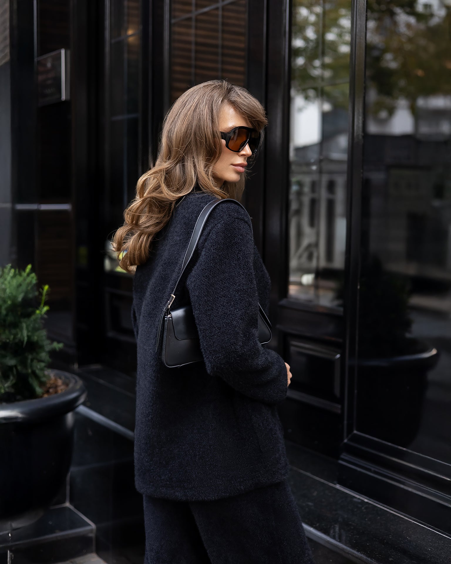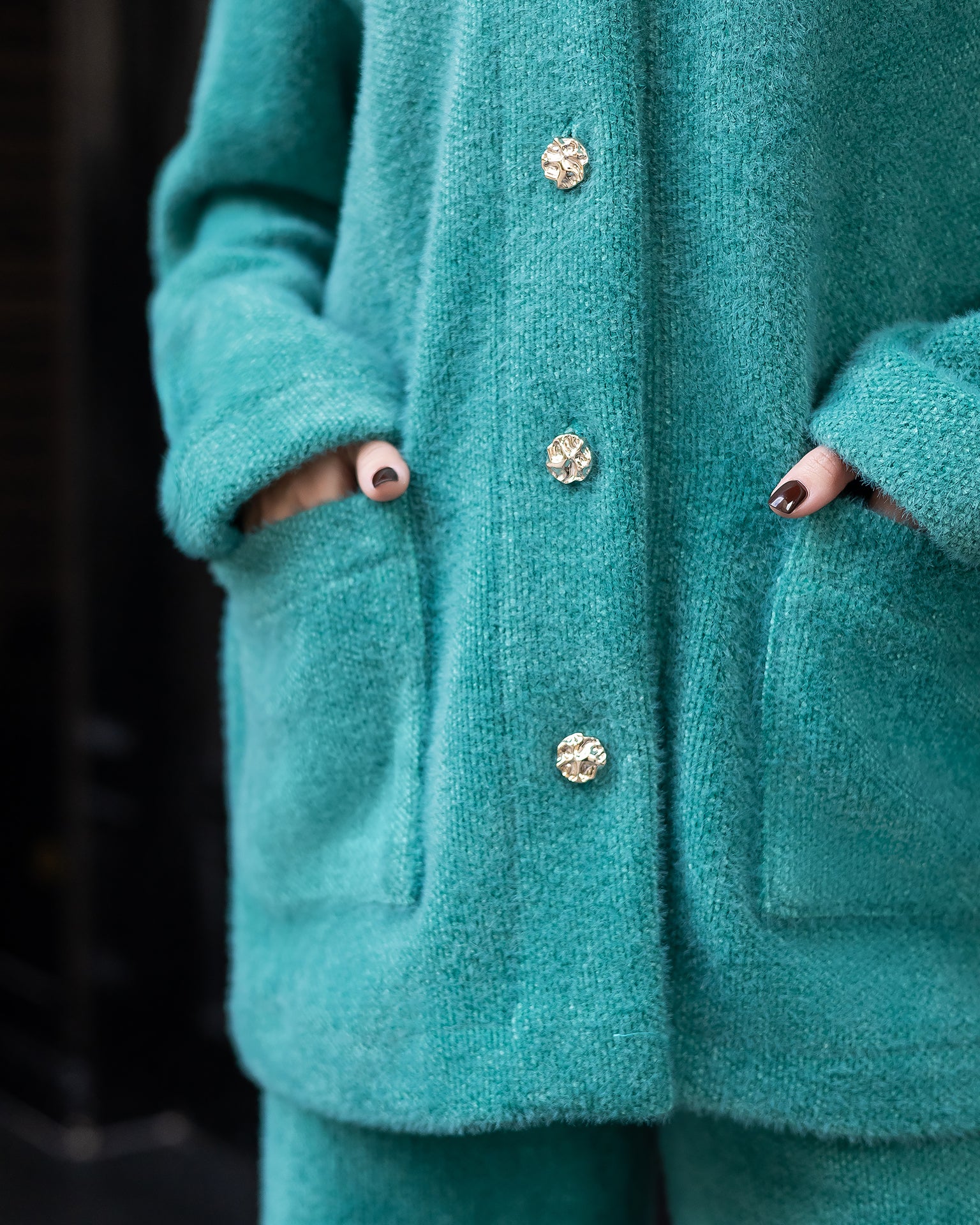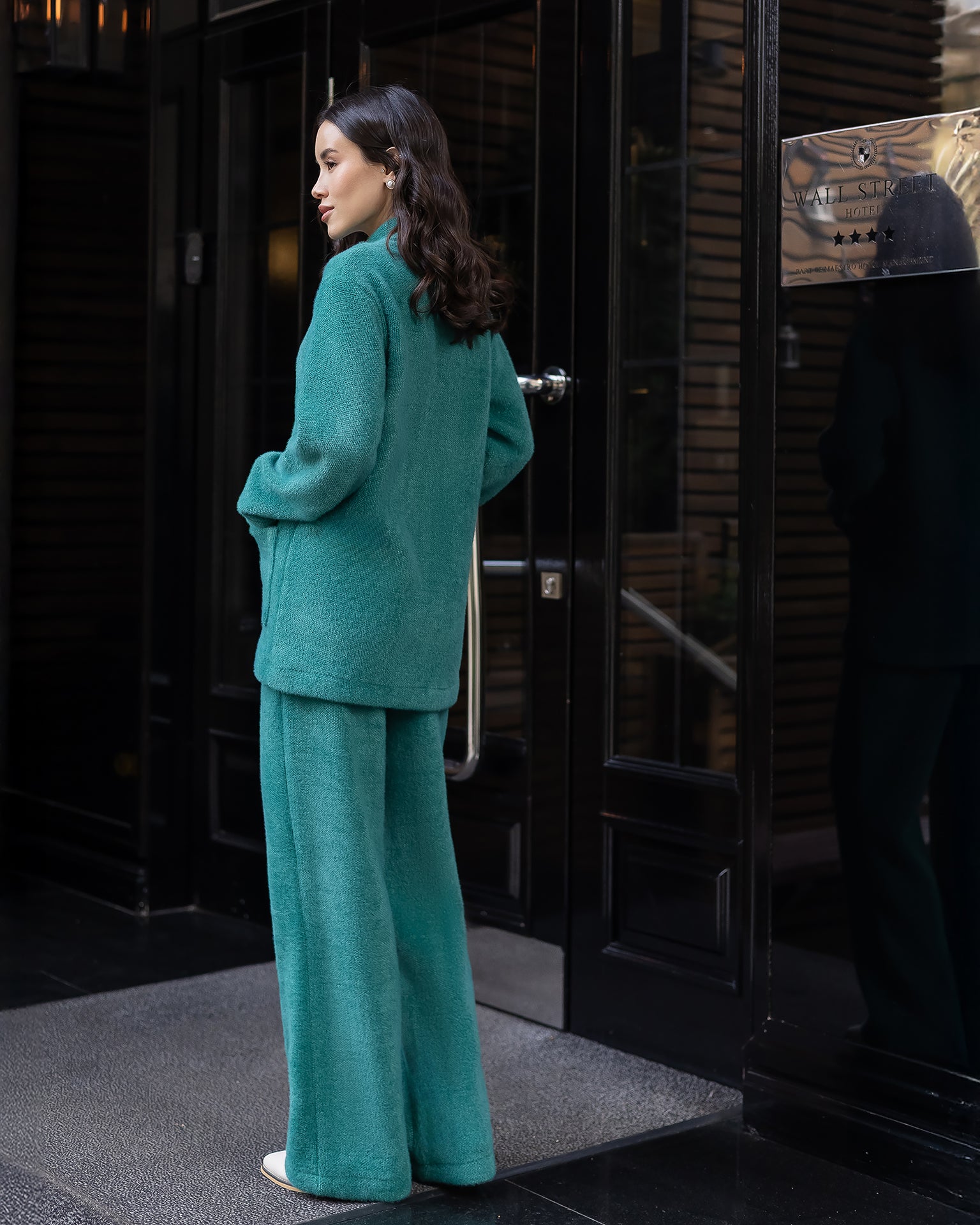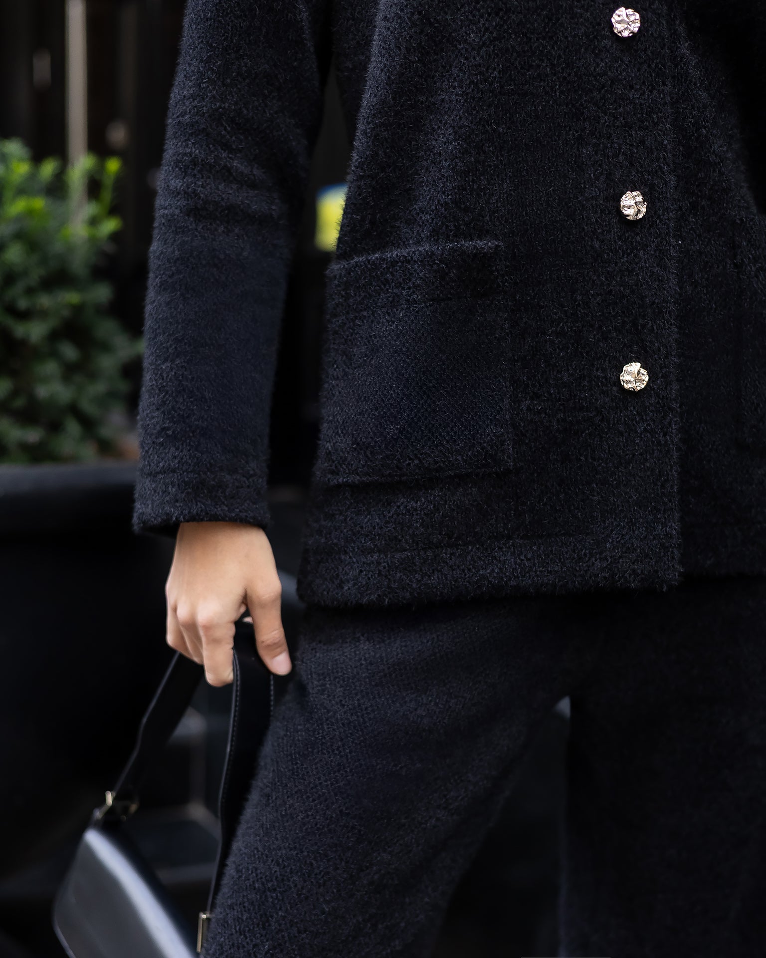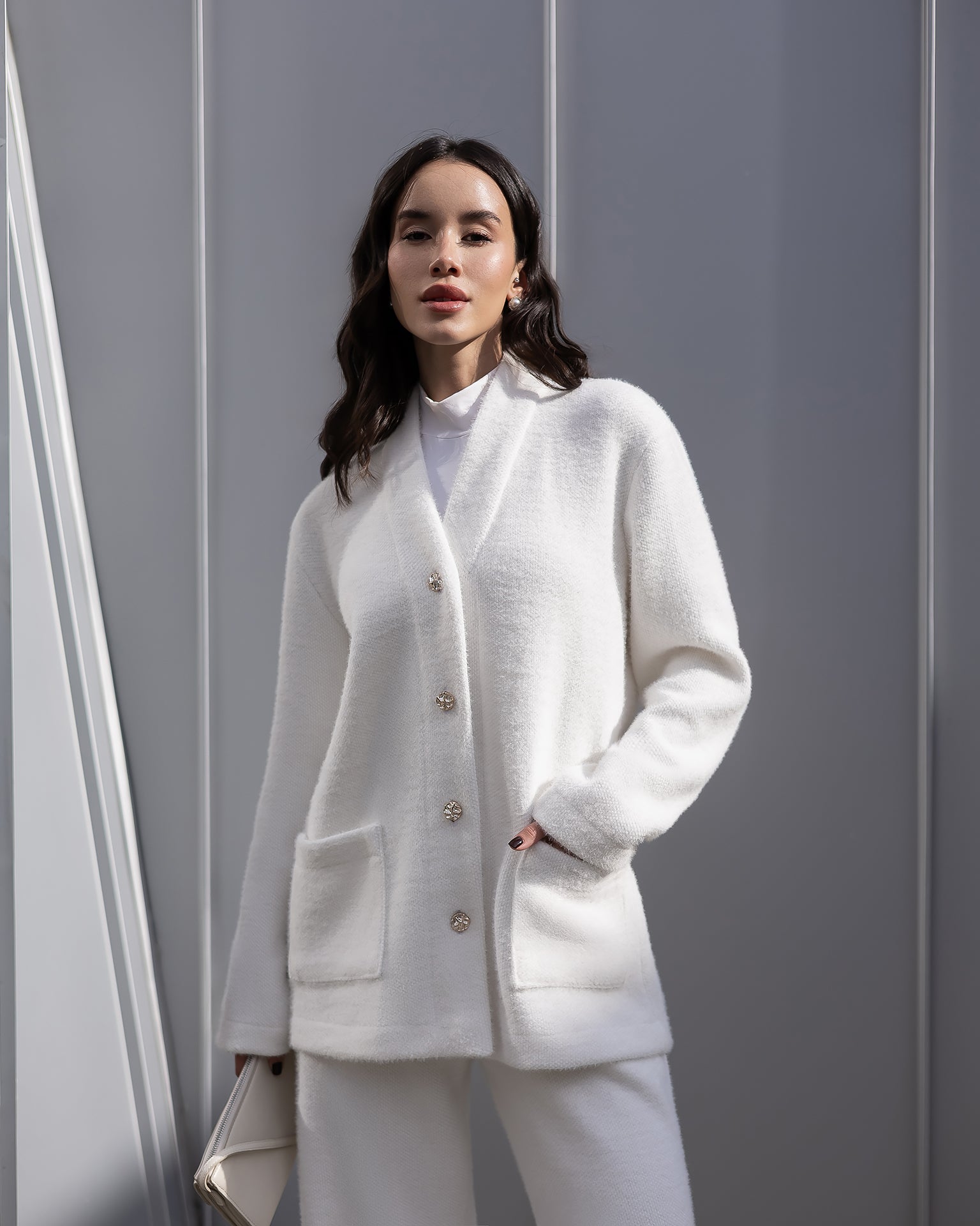 Silvenza Set — a cozy two-piece ensemble crafted from exceptionally soft, plush Silva fabric. The relaxed cardigan with signature statement buttons pairs with wide-leg trousers, creating an elevated yet comfort-driven look perfect for everyday luxury.