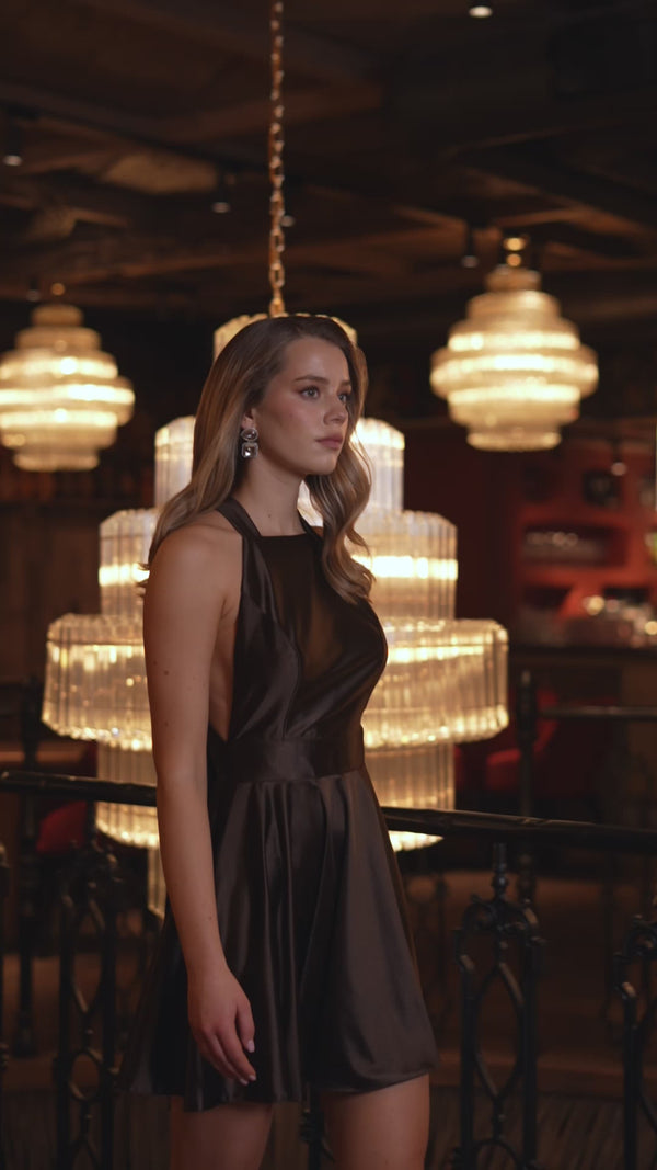 Veloura Halter Mini Dress — a refined mini dress with an elegant halter neckline and an open back accented by a graceful satin bow. Crafted from premium silk biflex, it softly hugs the body, creating a fluid, feminine silhouette with a luxurious sheen and evening allure.